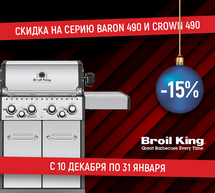 Покупая любой гриль Broil King серии Baron 490 и Crown 490, вы получаете дополнительную скидку -15%! Акция действует с 10 декабря 2025 года по 31 января 2026 года.