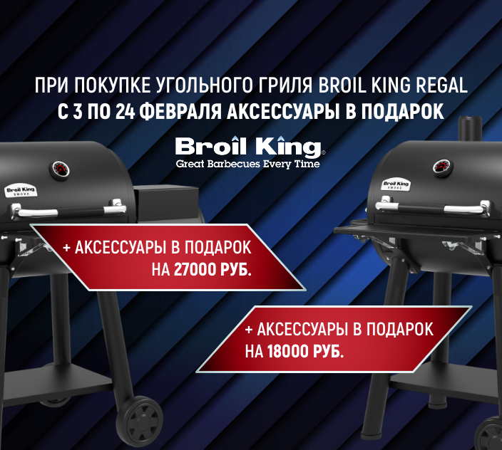 Покупая угольный гриль Broil King Regal 400 или Regal Offset 400, вы получаете аксессуары в подарок! Акция действует с 3 по 24 февраля 2026 года.