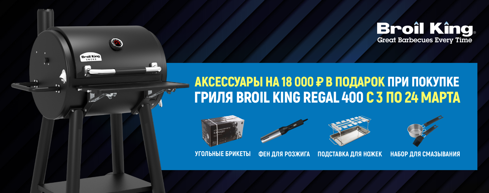 Купил гриль — получил подарки! Специально для любителей готовить вкуснейшие блюда на открытом огне мы подготовили уникальное предложение! Покупая угольный гриль Broil King Regal 400, вы получаете 4 аксессуара на сумму 18 000 ₽ в подарок! Акция действует с 3 по 24 марта 2026 года.