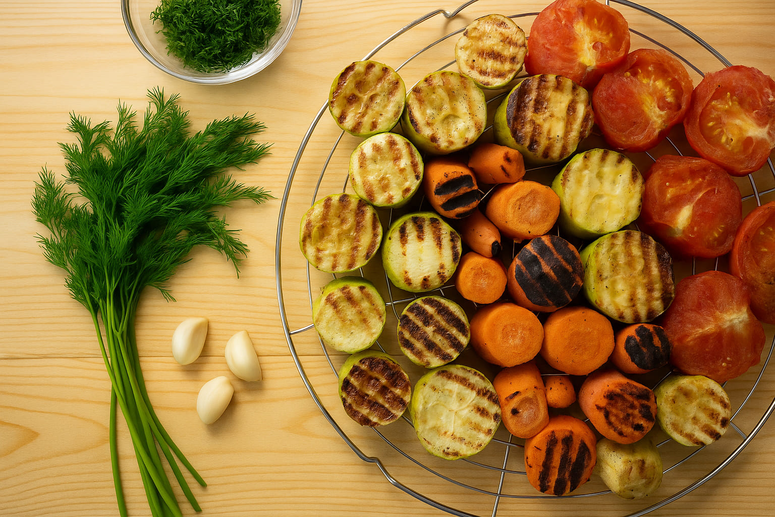 Овощи нарезают крупными кусками, смазывают маслом, слегка подсаливают. Это помогает сохранить сочность и предотвратить прилипание к решётке.