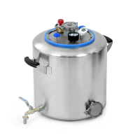 Силиконовое уплотнение прочно герметизирует крышку. Оно не имеет запаха, является химически нейтральным и выдерживает температуру до +200°С. Для правильного использования в конструкцию встроен манометр для отслеживания давления, клапан сброса избыточного давления и биметаллический термометр. Кламповое соединение предназначено для установки дистиллятора и расширения возможностей Вашего автоклава.