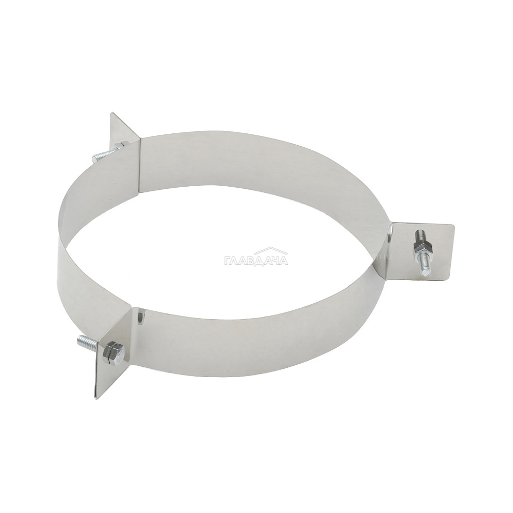 Хомут растяжки предназначен для фиксации дымохода, возвышающегося над кровлей более чем на 2 м в вертикальном положении. Фиксация хомута возможна с помощью тросов или штанги хомута растяжки. Края хомута стягиваются с помощью болтов и гаек.