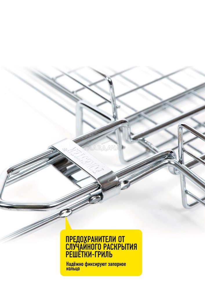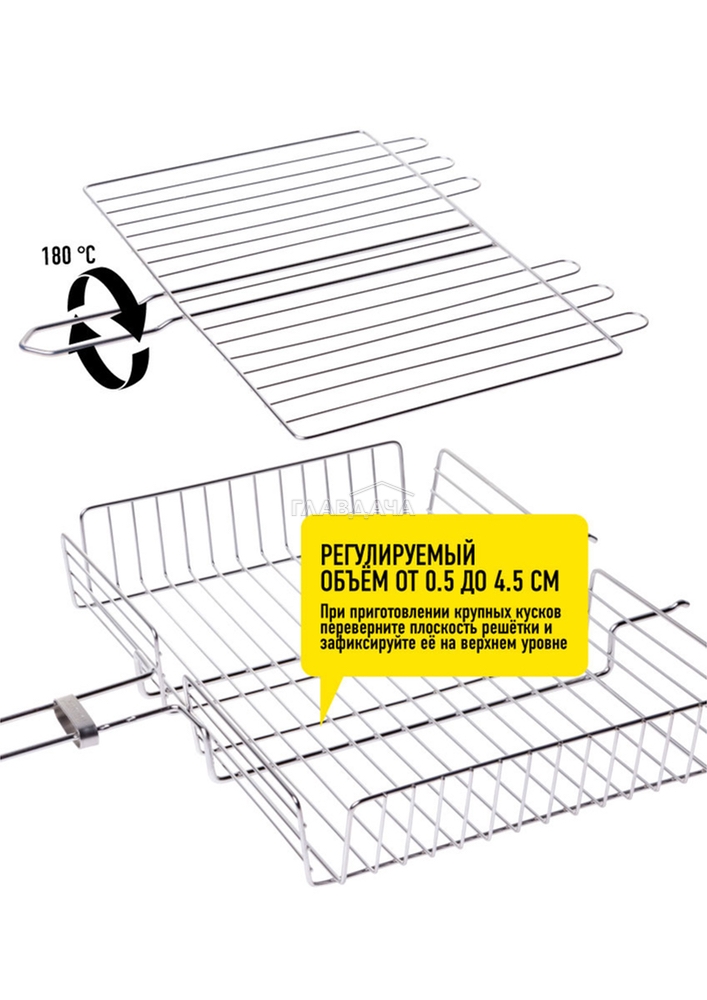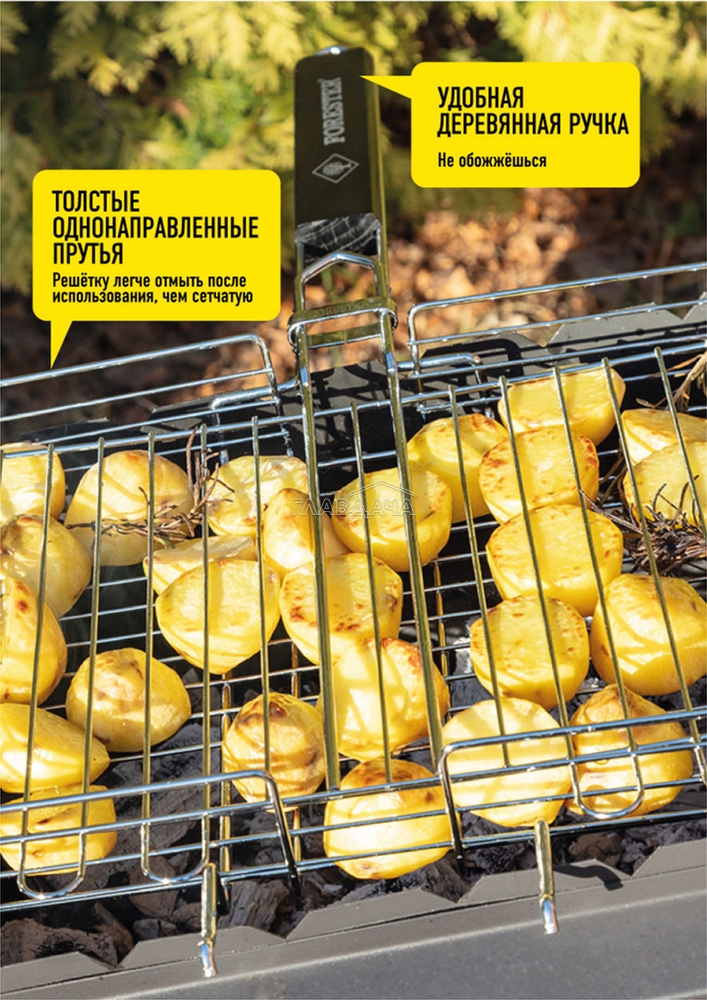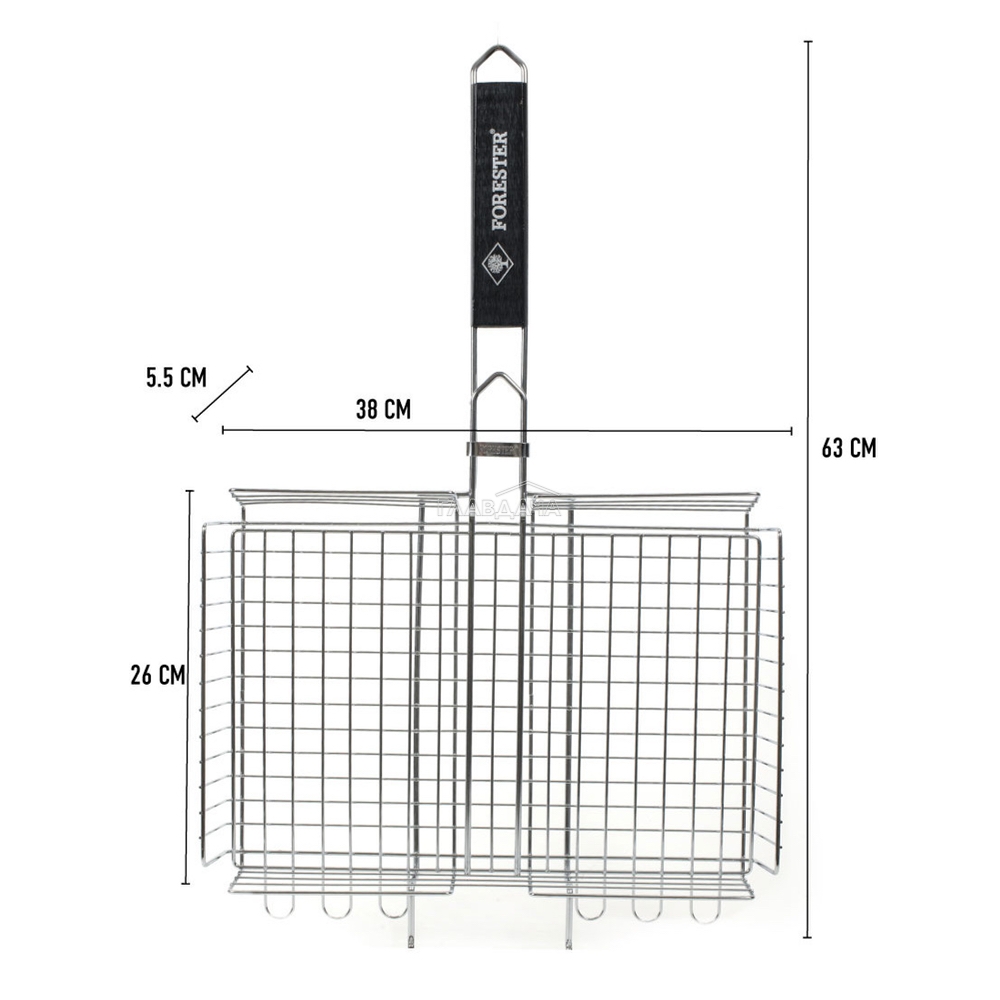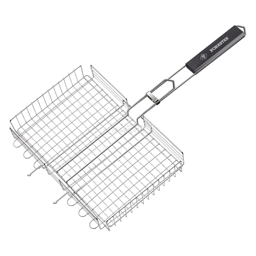Объёмная решётка-гриль Forester изготовлена из стали с пищевым антикоррозийным покрытием. Преимущество данной модели заключается в регулируемой высоте (от 0,5 до 4,5 см), что даёт возможность готовить на решётке как тонкие, так и крупные куски продуктов. Размеры рабочей поверхности позволяют разместить за один раз несколько порций. Эргономичная ручка из дерева практически не нагревается, благодаря чему является комфортной и безопасной для рук пользователя. Плотное фиксирующее кольцо исключает риск случайного раскрытия изделия во время приготовления пищи. Усики обеспечивают решётке-гриль повышенную устойчивость в процессе эксплуатации на мангале.