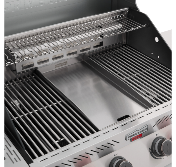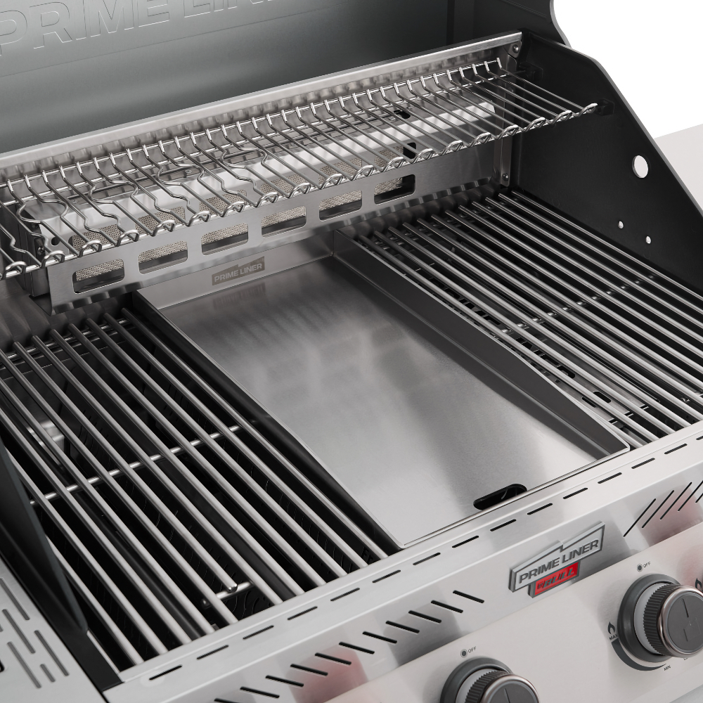 Планча выполнена из полированной нержавеющей стали толщиной 4 мм. Оснащена специальным отверстием для удобного удаления лишнего жира. На планче Вы сможете приготовить яичницу, оладьи или блинчики. Устанавливается вместо средней секции основной решётки на 4-горелочных грилях Primeliner.
