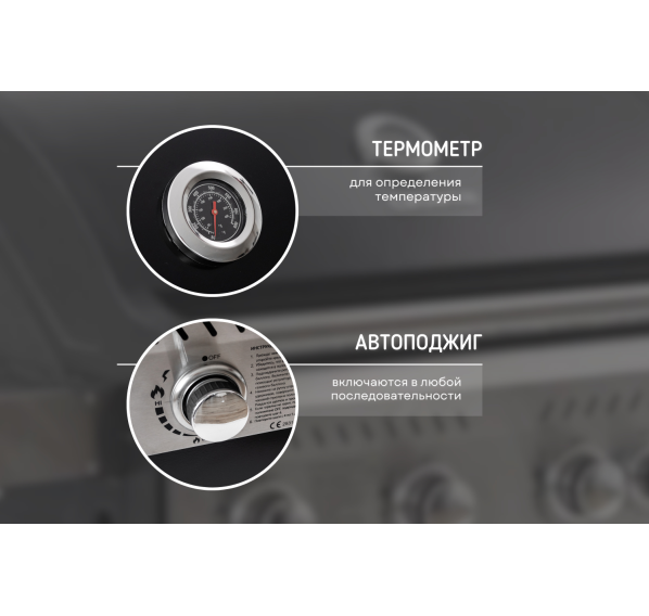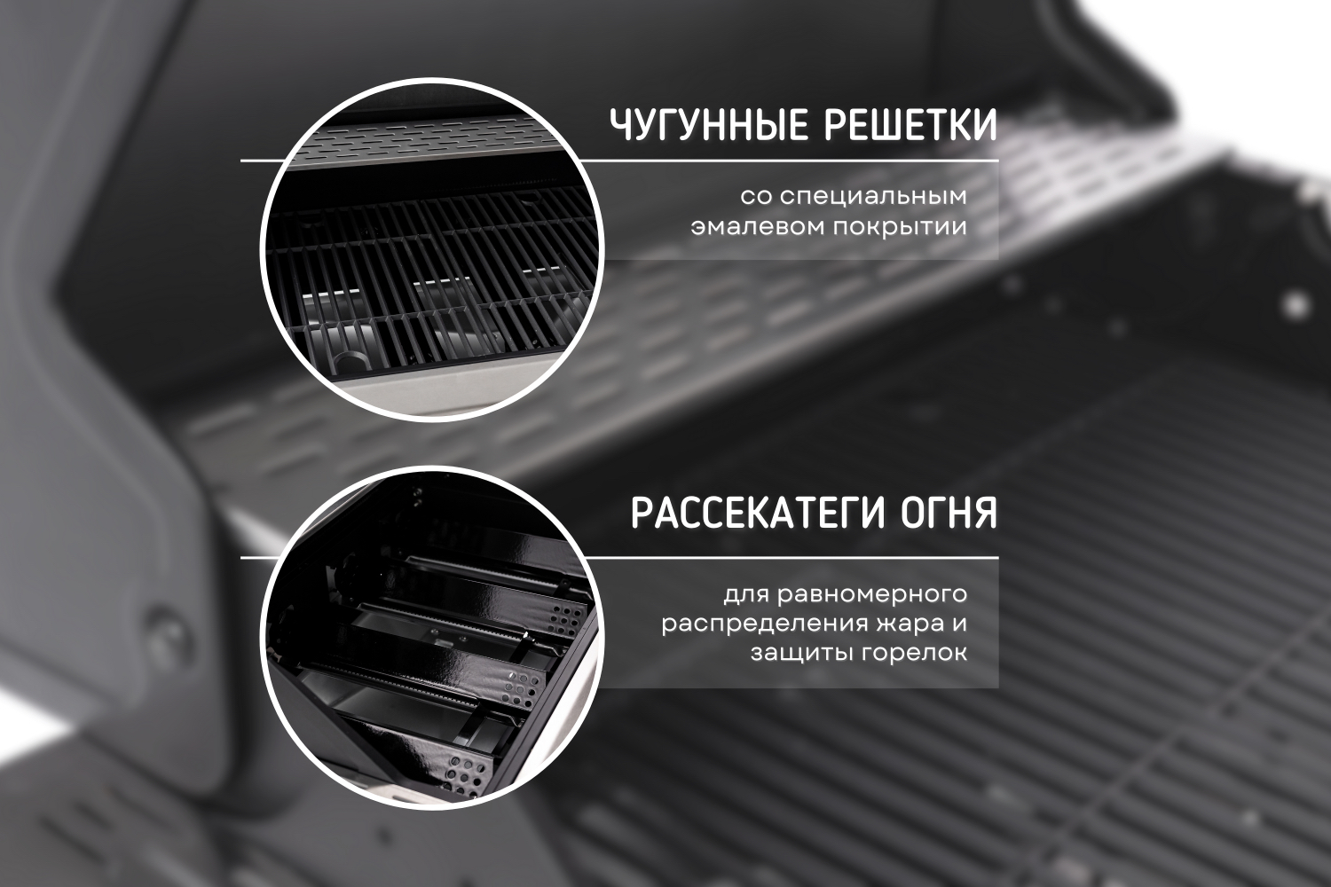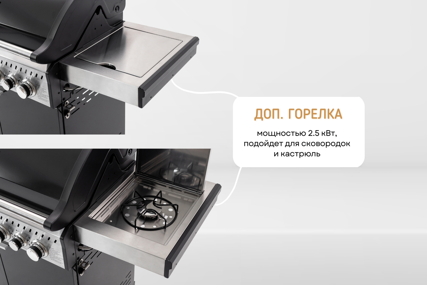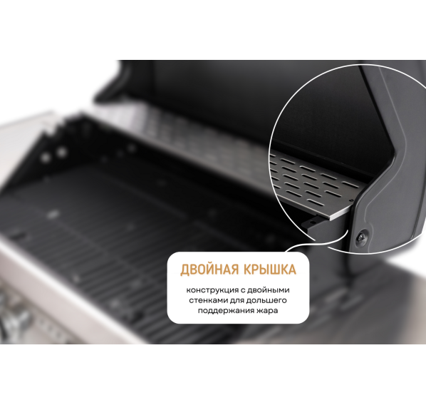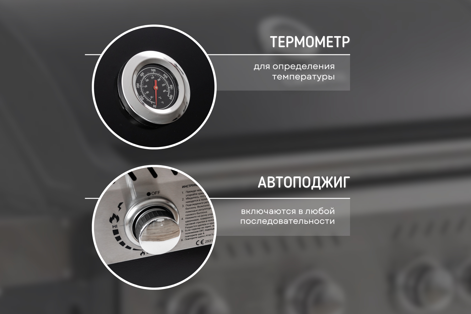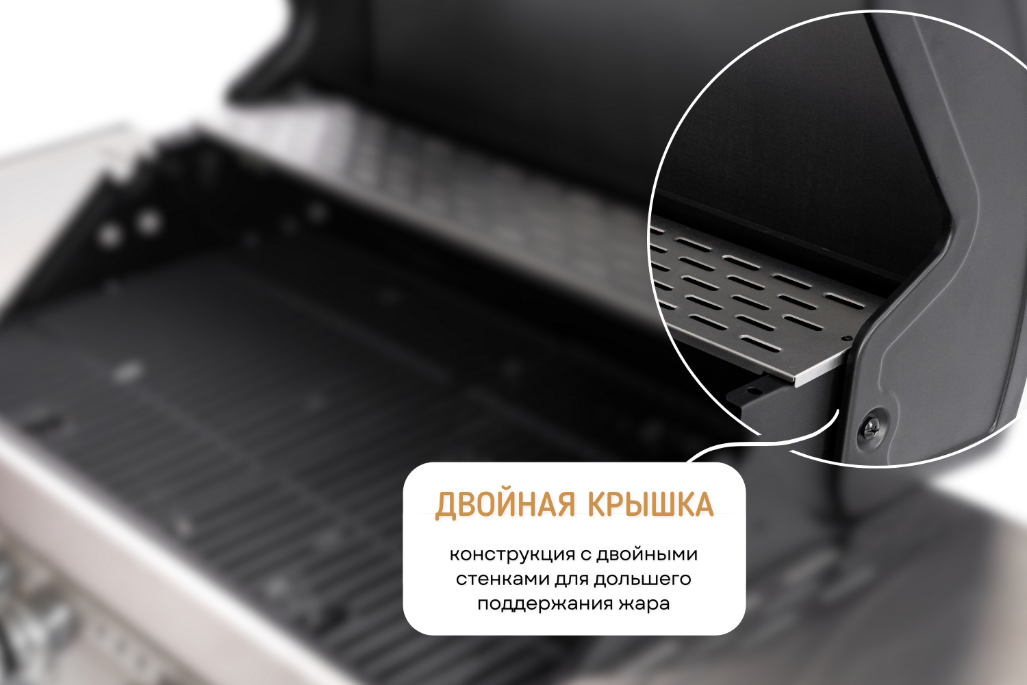 Этот гриль отличается элегантным дизайном, продуманностью конструкции полок и максимальной эргономичностью, позволяющей комфортно готовить блюда прямо на открытом воздухе. Оснащён встроенным термометром, удобным держателем для кухонных принадлежностей и системой автоматического розжига посредством пьезоэлемента. Универсальность гриля позволяет одинаково успешно справляться как с быстрой обжаркой мяса и овощей, так и с длительным процессом тушения и копчения продуктов.