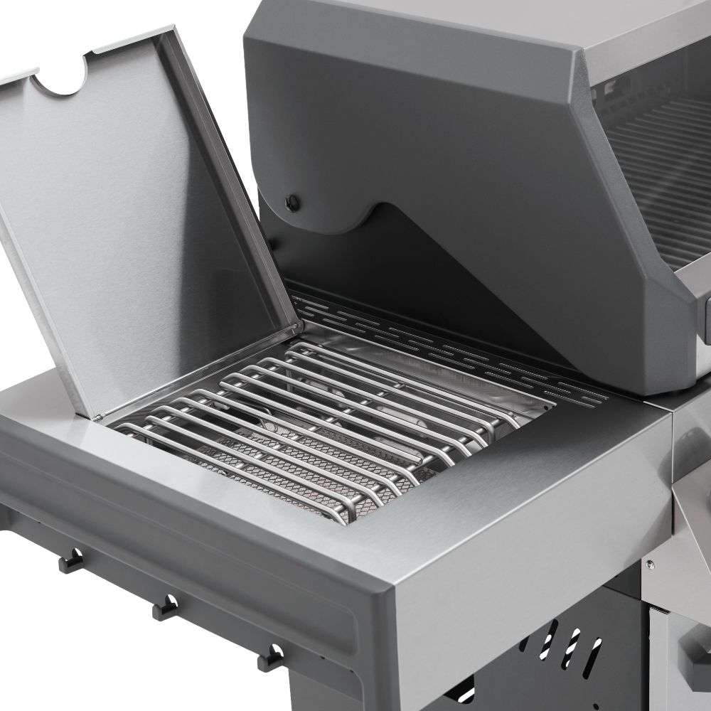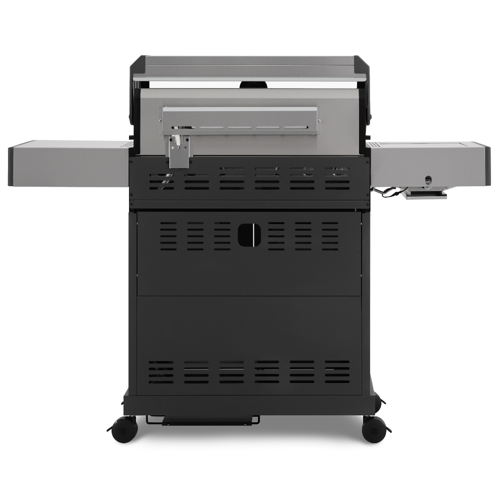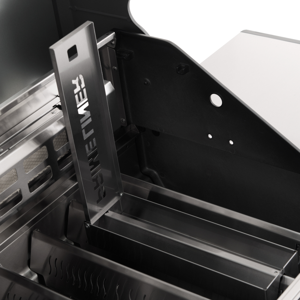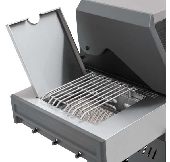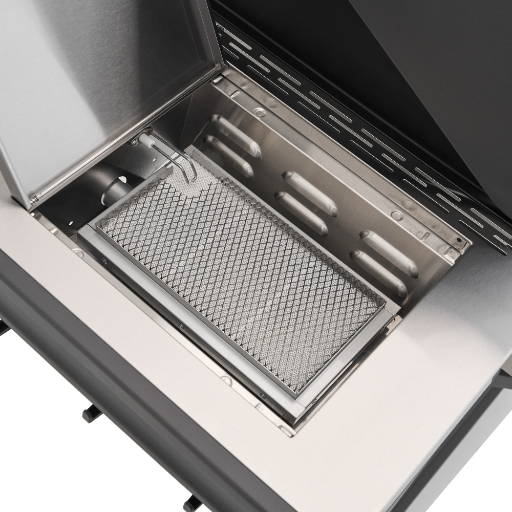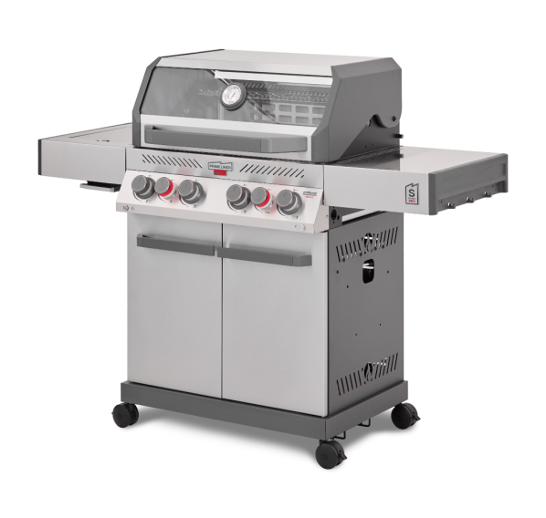Главной особенностью модели является инновационное решение — большое панорамное стекло Clear Vision, выполненное из специального сверхпрочного закалённого материала. Благодаря этому окну владелец имеет возможность визуально контролировать процесс приготовления блюд прямо изнутри гриля, создавая незабываемые впечатления от процесса готовки. Primeliner S Class Pro 4B изготовлен исключительно из высококачественных материалов: корпус выполнен из прочной нержавеющей стали, отдельные элементы выполнены из литого алюминия, обеспечивая долговечность и устойчивость конструкции даже при интенсивном использовании. Гриль оснащён четырьмя мощными газовыми турбогорелками Blade, обеспечивающими равномерное распределение тепла и быстрый нагрев рабочей поверхности. Дополнительные опции включают увеличенную боковую инфракрасную горелку Broil Zone+, предназначенную для быстрой обжарки мяса и овощей, а также заднюю инфракрасную горелку, создающую идеальные условия для приготовления различных блюд. Особое внимание уделено комфорту пользователей: устройство оснащено встроенным модулем копчения Prime Smoker, позволяющим экспериментировать с ароматическими дымами, придавая блюдам особый вкус и аромат. Для удобства эксплуатации предусмотрен термостойкий защитный коврик на пристолье, предотвращающий повреждения.