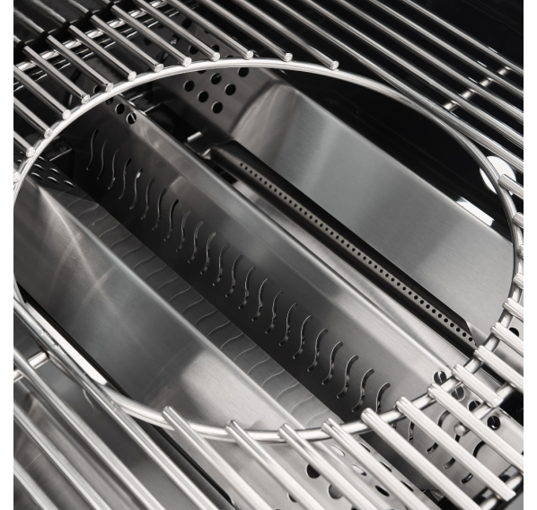 Уникальная система решёток позволяет легко снимать круглый сегмент для установки казана или вока, открывая новые возможности для экспериментов с азиатской кухней и классическими рецептами. Турбогорелка Sear Zone обеспечивает мгновенное создание хрустящей корочки на стейках, сохраняя сочность мяса внутри. Идеально подходит для тех, кто ценит идеальное прожаривание и аппетитный внешний вид блюда. Классическая боковая горелка позволяет готовить первые блюда, варить кофе или кипятить воду, делая процесс готовки полноценным и комфортным. Подсветка зоны готовки не только стильный элемент дизайна, но и весьма функциональный, позволяющий комфортно ориентироваться в процессе приготовления даже в вечернее время суток. Долговечная и устойчивая к коррозии решётка из нержавеющей стали толщиной 7 мм гарантирует долгий срок службы гриля, сохраняя первоначальный внешний вид и функциональность.