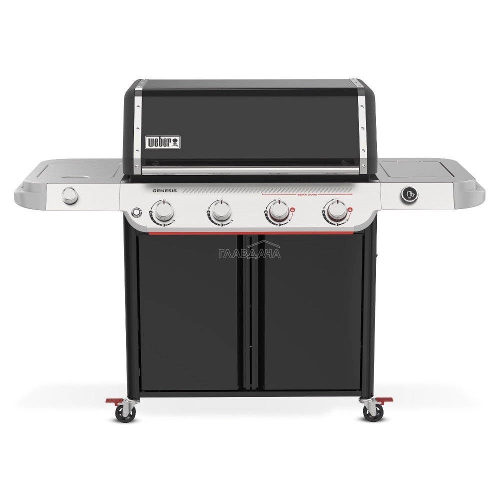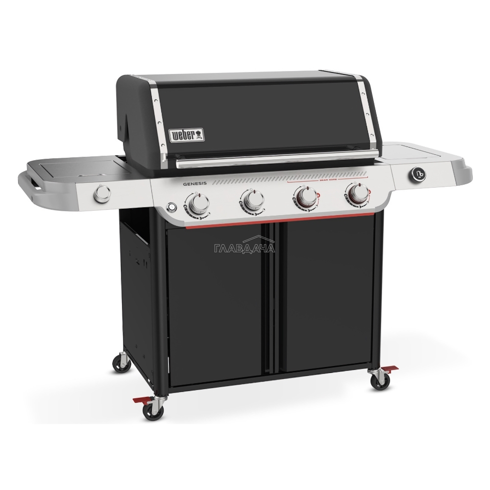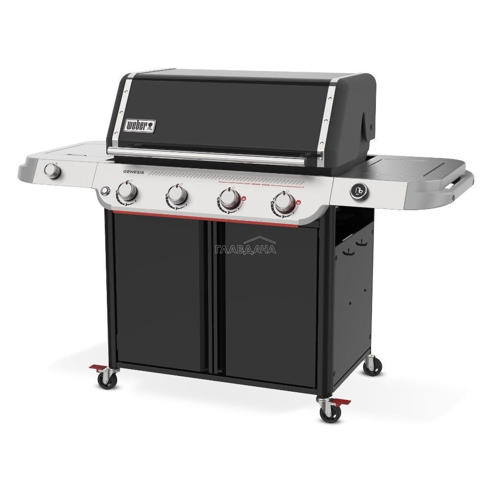 Выдающимся новшеством газового гриля Weber Genesis E-435W является встроенная система Weber Works, расположенная на правом боковом столе. Эта функциональная система включает в себя съёмную крышку, направляющие и крючки, предназначенные для того, чтобы Ваши инструменты и принадлежности всегда были организованы и находились в пределах досягаемости. В левом боковом столе расположена конфорка для приготовления фирменного соуса или гарнира, пока основное блюдо готовится под крышкой гриля.