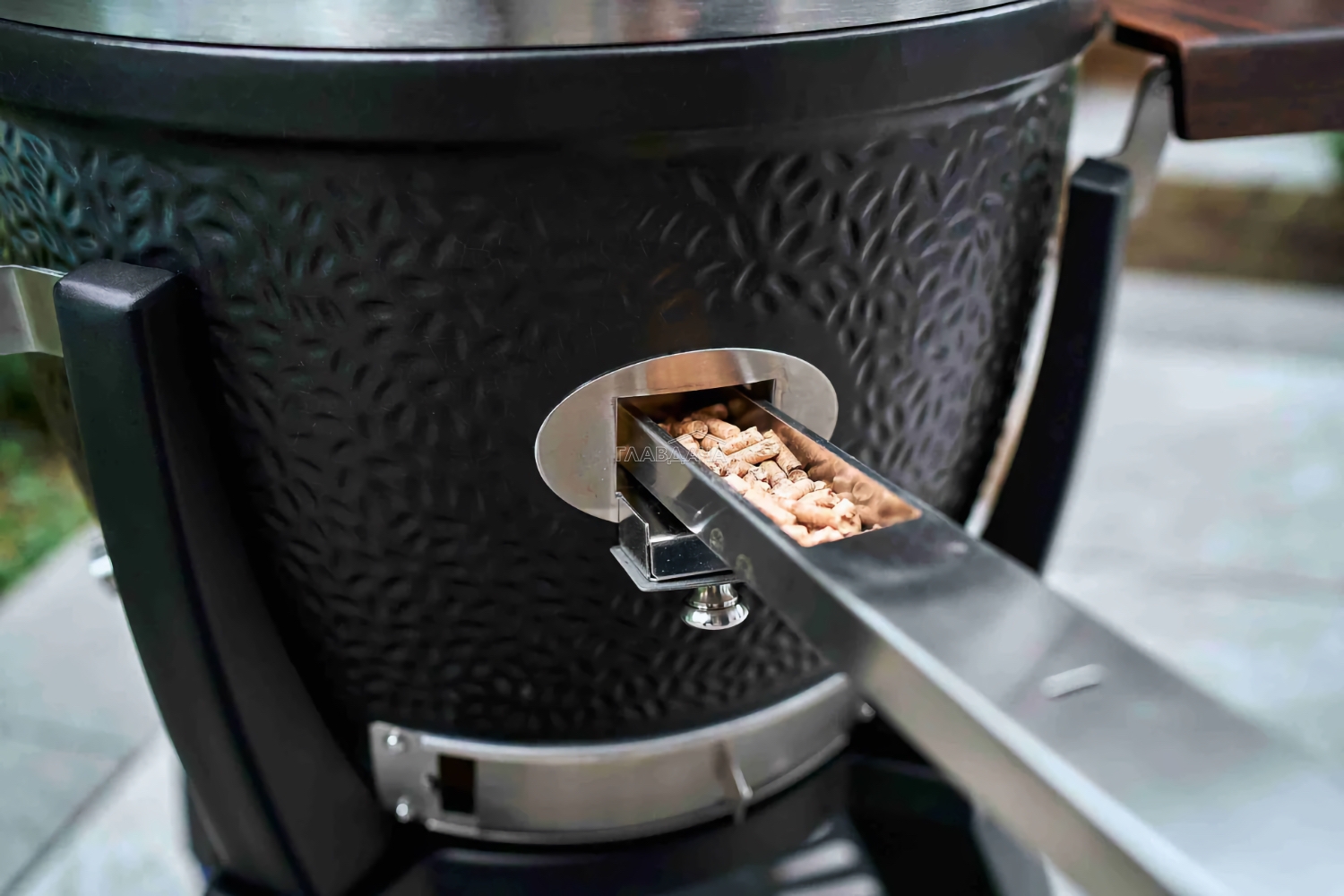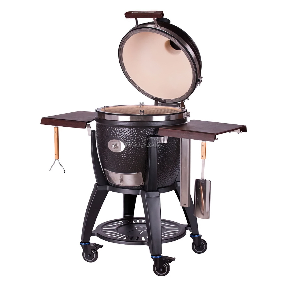 Гриль отличается стильной матово-минеральной глазурью, усиленными ножками с колёсиками, боковыми столиками из влагостойкого карбонизированного бамбука и расширенным функционалом благодаря светодиодной подсветке и утолщённой фурнитуре из нержавеющей стали. Устройство оснащено системой раздельного приготовления двух блюд одновременно и возможностью регулировки уровня решёток над углями. Гриль комплектуется всеми необходимыми аксессуарами, включая корзину для углей с разделителем, поддоны для сбора жира, керамические жароотсекатели, две решётки в форме полумесяца из нержавеющей стали, направляющая для подбрасывания щепы для копчения, лопатка для лёгкого удаления золы, а также ручка для снятия решёток. Дополняется устройство камнями для пиццы, сковородами-вок и иными аксессуарами, превращая гриль в полноценную уличную кухню.