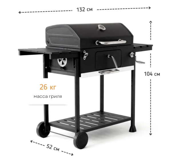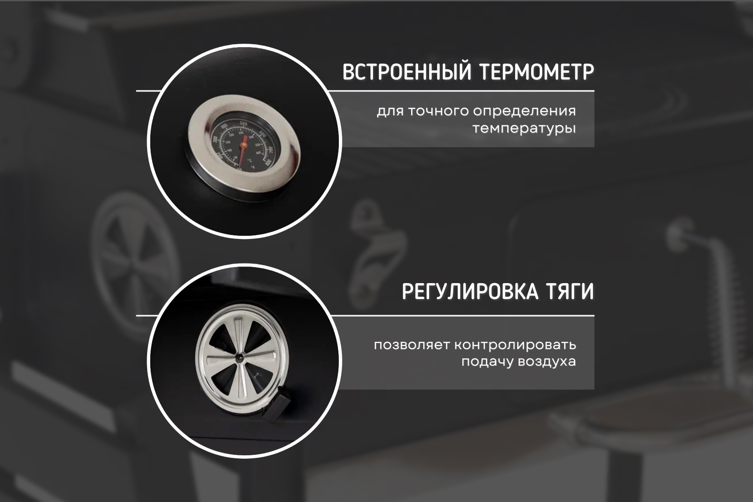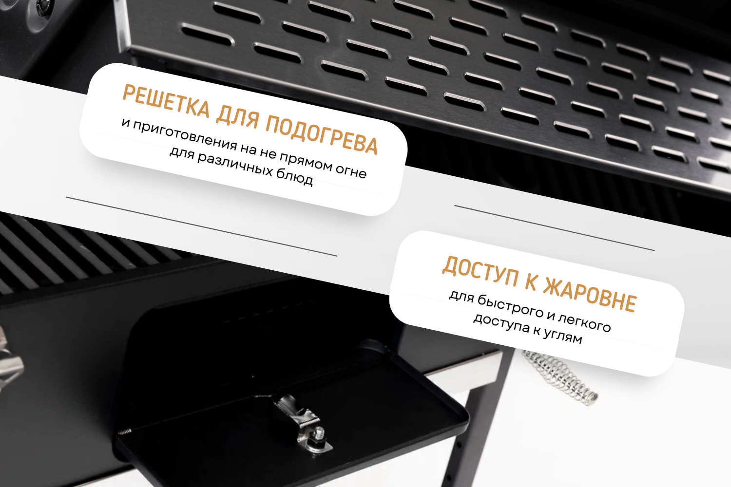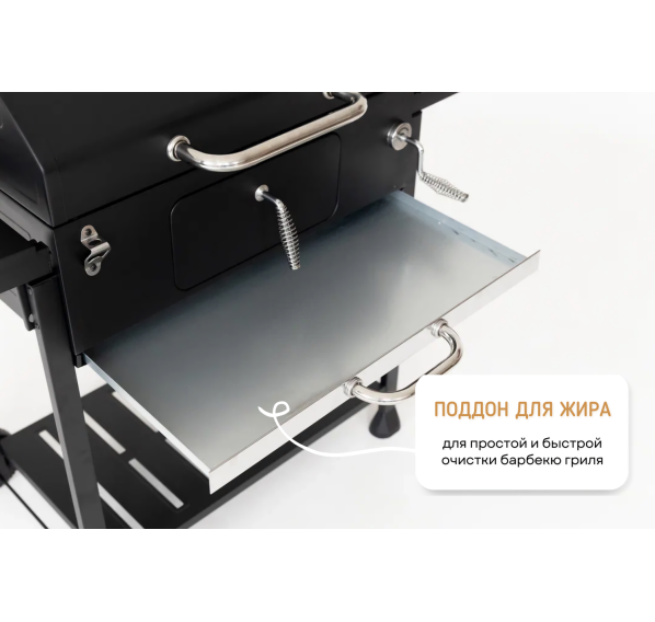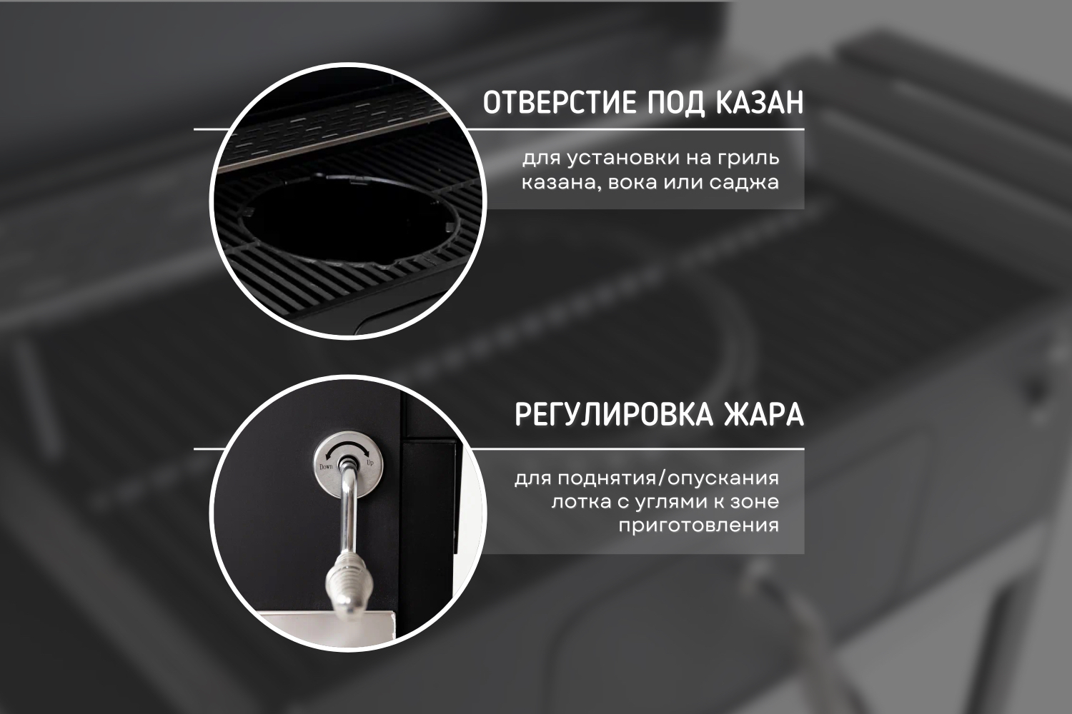 Гриль выполнен из прочной стали с термостойким порошковым покрытием, что гарантирует устойчивость к влаге, перепадам температур и выгоранию на солнце. Надёжная конструкция, эргономичная крышка с встроенным термометром и система регулировки жара обеспечивают точный контроль процесса приготовления. В комплекте предусмотрено съёмное центральное кольцо в решётке под казан, а также выдвижной зольник для удобной очистки от золы и углей. Дополнительные полки и крючки позволяют хранить аксессуары и инструменты под рукой. Колёса облегчают перемещение гриля по участку.