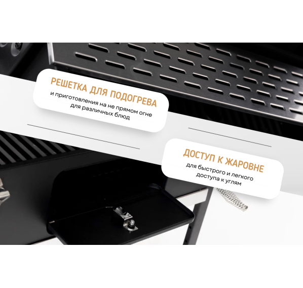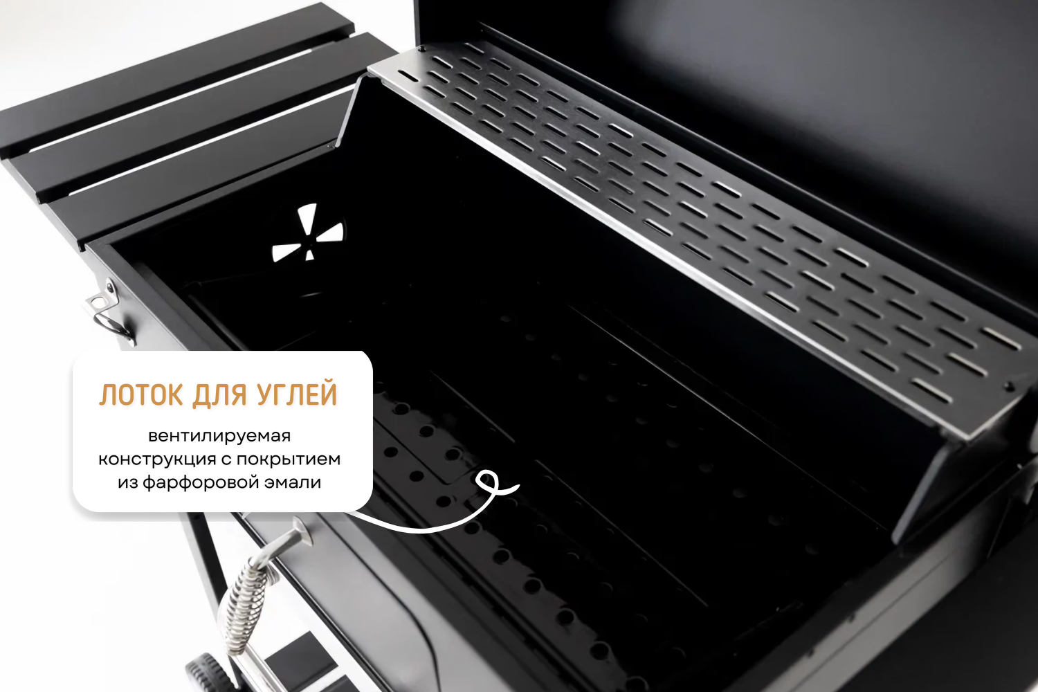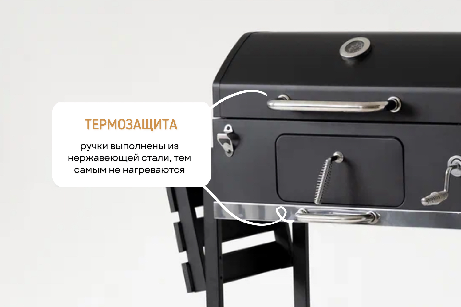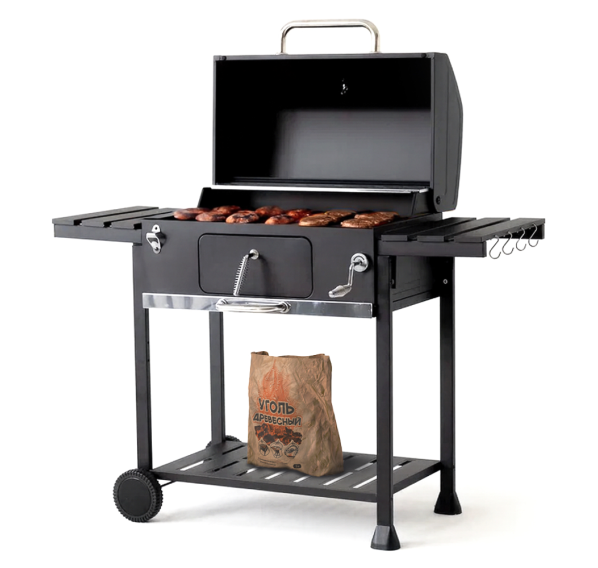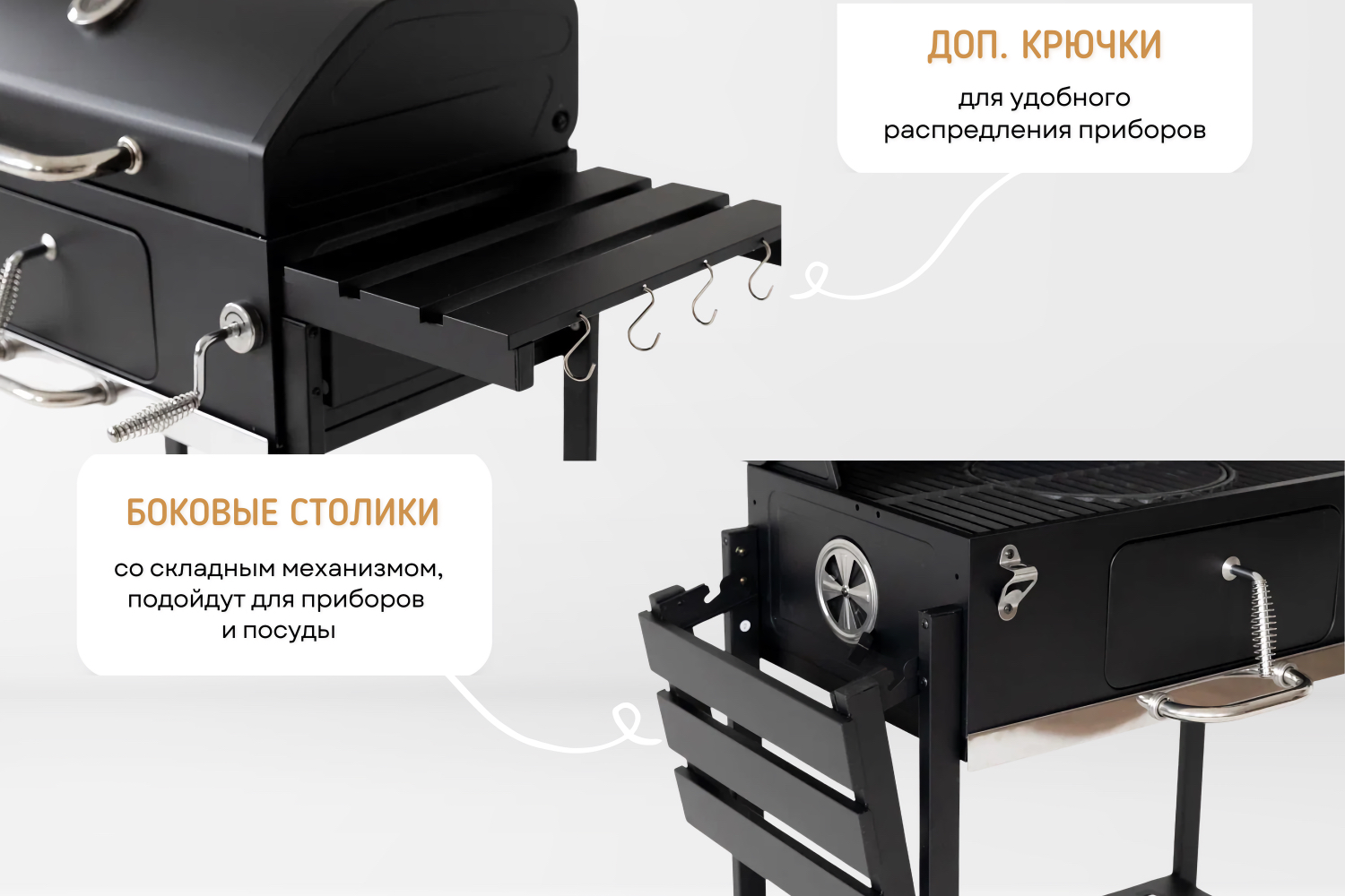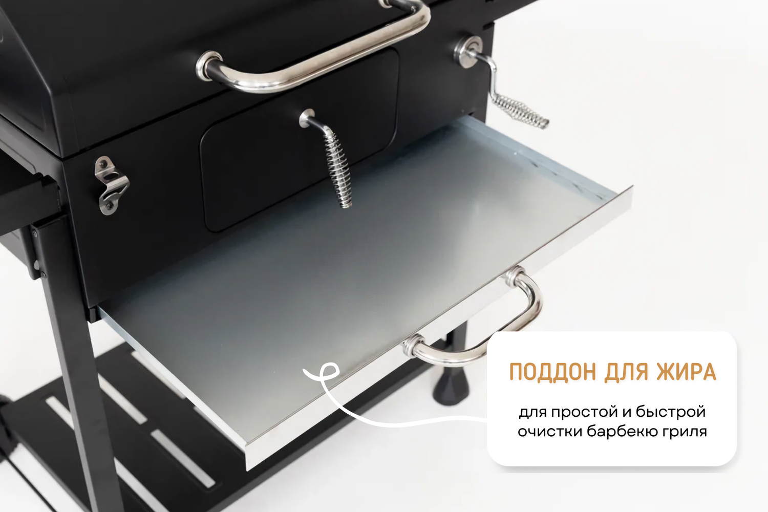 Гриль выполнен из прочной стали с термостойким порошковым покрытием, что гарантирует устойчивость к влаге, перепадам температур и выгоранию на солнце. Надёжная конструкция, эргономичная крышка с встроенным термометром и система регулировки жара обеспечивают точный контроль процесса приготовления. В комплекте предусмотрено съёмное центральное кольцо в решётке под казан, а также выдвижной зольник для удобной очистки от золы и углей. Дополнительные полки и крючки позволяют хранить аксессуары и инструменты под рукой. Колёса облегчают перемещение гриля по участку.