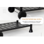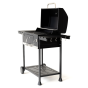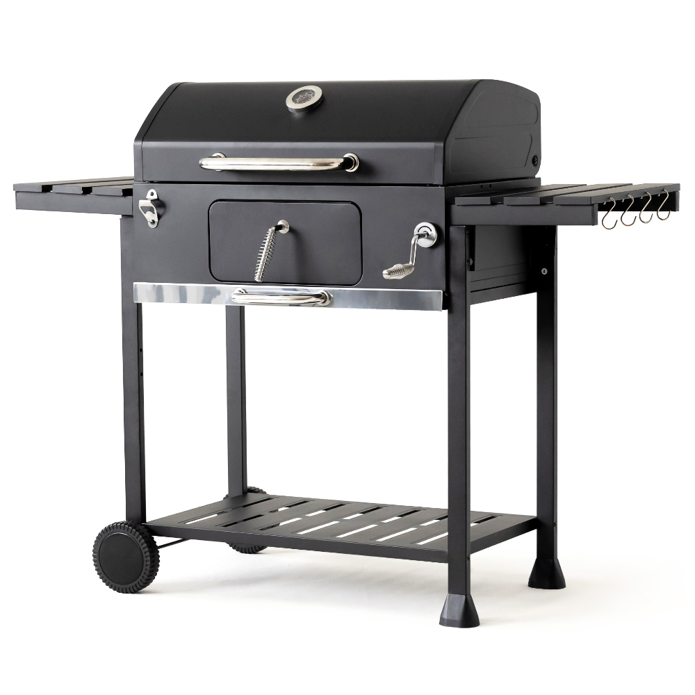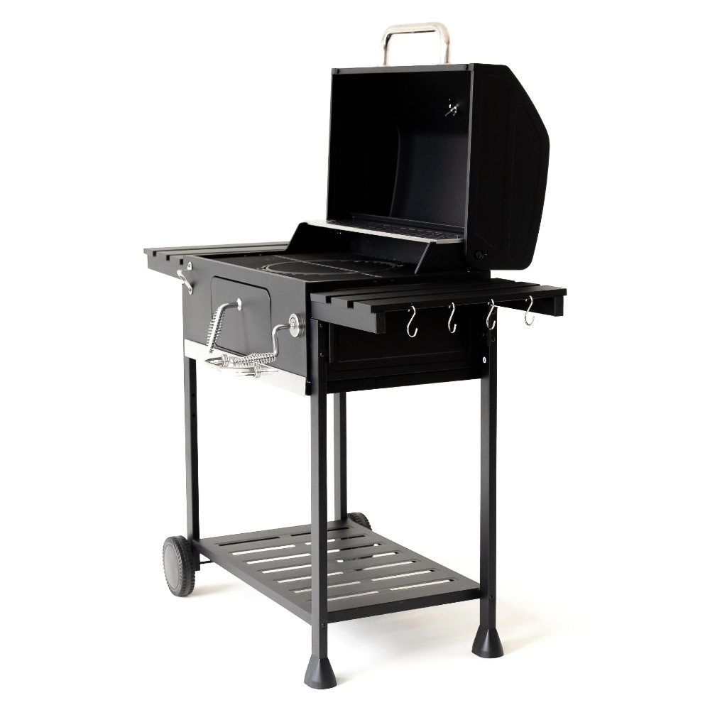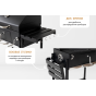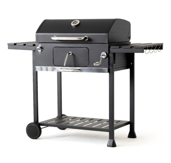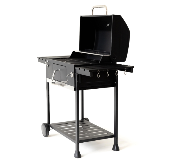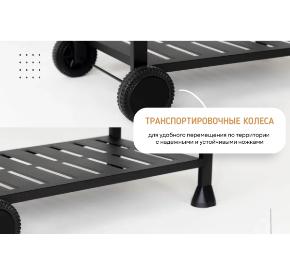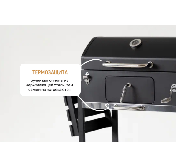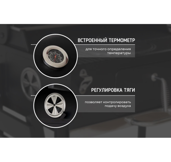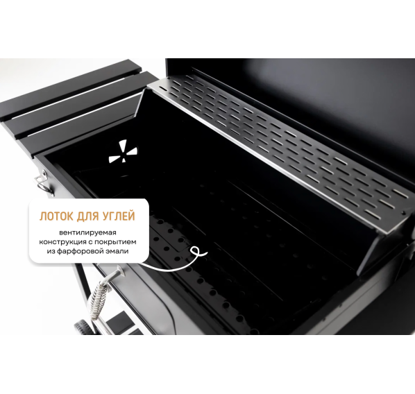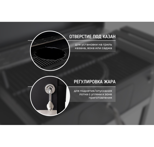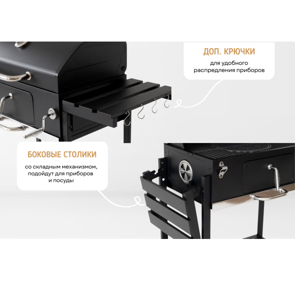 Гриль выполнен из прочной стали с термостойким порошковым покрытием, что гарантирует устойчивость к влаге, перепадам температур и выгоранию на солнце. Надёжная конструкция, эргономичная крышка с встроенным термометром и система регулировки жара обеспечивают точный контроль процесса приготовления. В комплекте предусмотрено съёмное центральное кольцо в решётке под казан, а также выдвижной зольник для удобной очистки от золы и углей. Дополнительные полки и крючки позволяют хранить аксессуары и инструменты под рукой. Колёса облегчают перемещение гриля по участку.