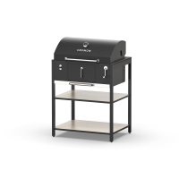 Гриль оснащён 4 заслонками, с помощью которых Вы можете регулировать температуру горения угля, причём делать это можно отдельно как в правой, так и в левой части гриля. Съёмный ящик для золы позволяет с лёгкостью очищать гриль. В стол интегрирован вместительный выдвижной ящик, в котором можно хранить необходимые инструменты. Кстати, помимо решётки в комплект входит рамка для шампуров и кочерга с совком для чистки гриля.