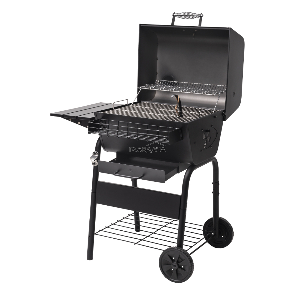 Гриль легко перемещать благодаря двум большим колёсам, а при остановке он устойчив за счёт двух прочных опор. Нижняя полка удобна для хранения угля, топлива и аксессуаров для готовки. А зольник, расположенный спереди, обеспечивает быструю и простую очистку после использования. Регулируемый по высоте угольный поддон позволяет контролировать интенсивность жара, адаптируя температуру под конкретные блюда.