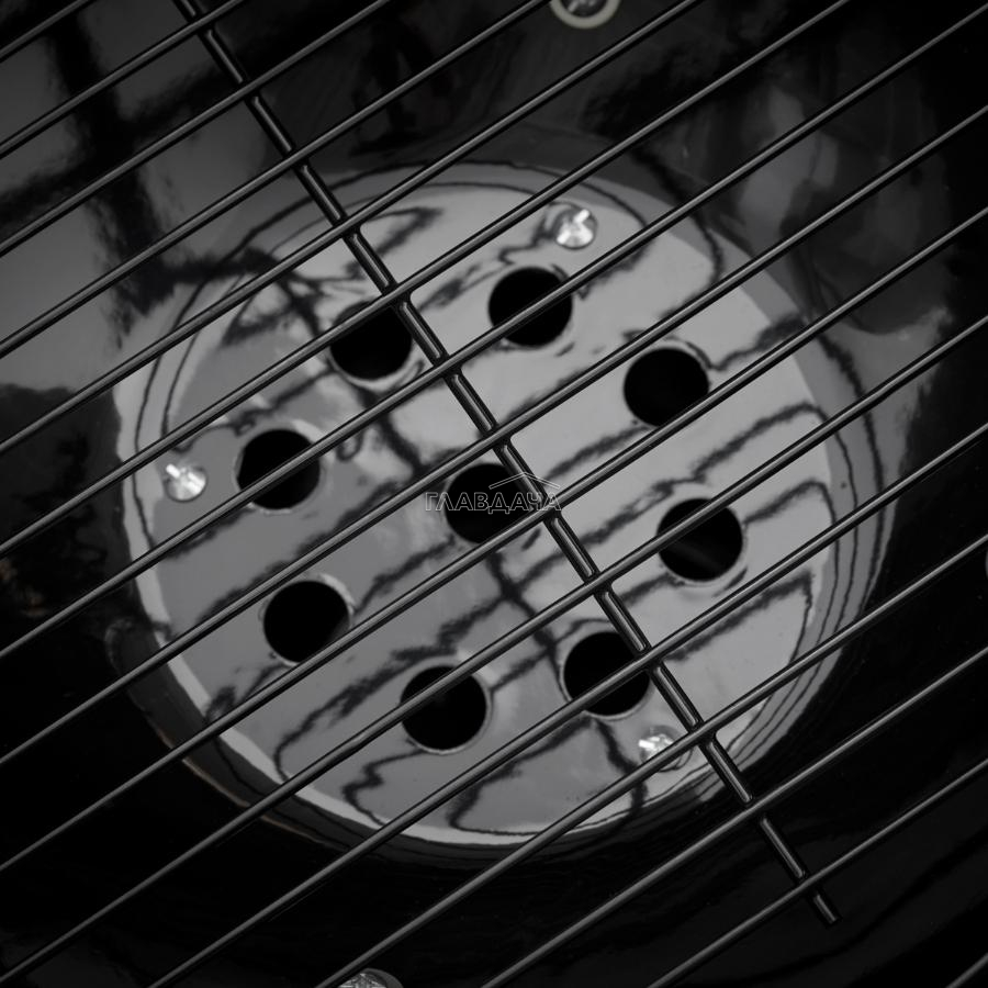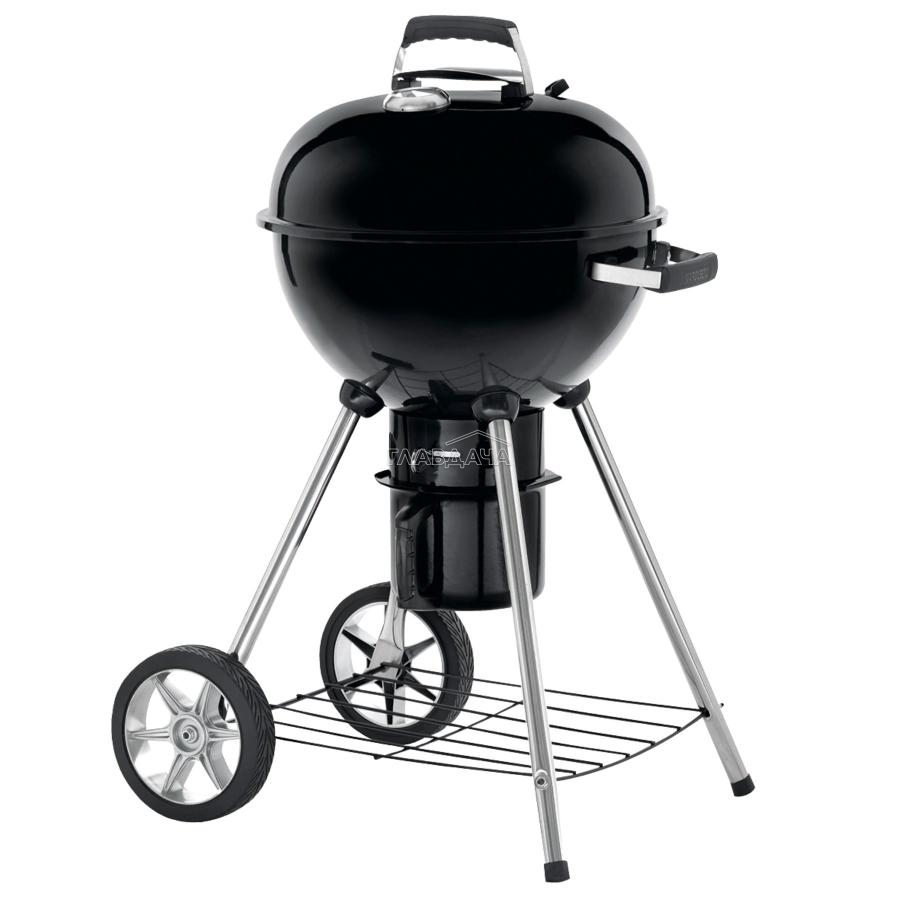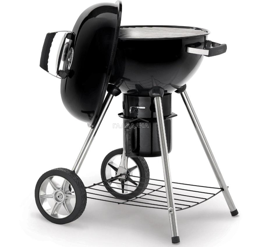 Гриль угольный покрытый жаропрочной фарфоровой эмалью (топка и крышка), датчик температуры, барбекю-решетка, большой съемный зольник, 4 ножки, 2 всепогодных колеса, стальная полка.