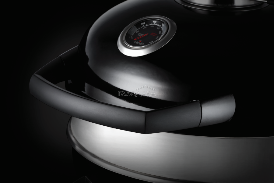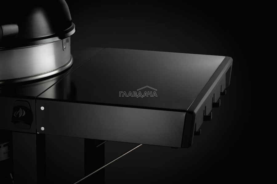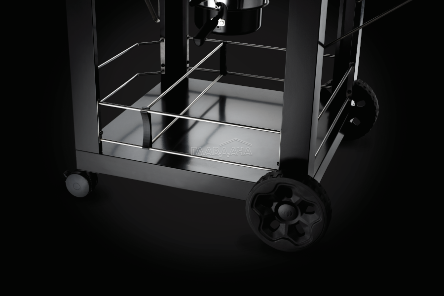 Гриль угольный покрытый жаропрочной фарфоровой эмалью (топка, крышка), датчик температуры, чугунная массивная барбекю решетка с поднимающимися створками, большой съемный зольник, складывающиеся пристолье (стол-тележка) ,4 всепогодных колеса с фиксаторам