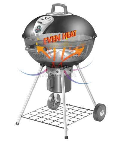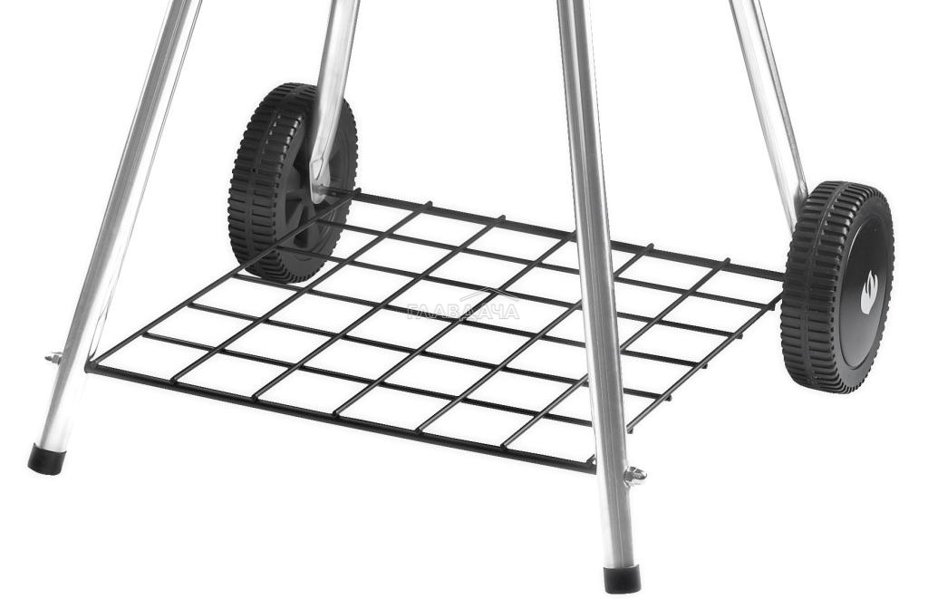 Гриль угольный покрытый жаропрочной фарфоровой эмалью ( топка , крышка), датчик температуры, чугунная массивная барбекю решетка с поднимающимися створками, большой съемный зольник, 4 ножки, 2 всепогодных колеса, стальная полка.