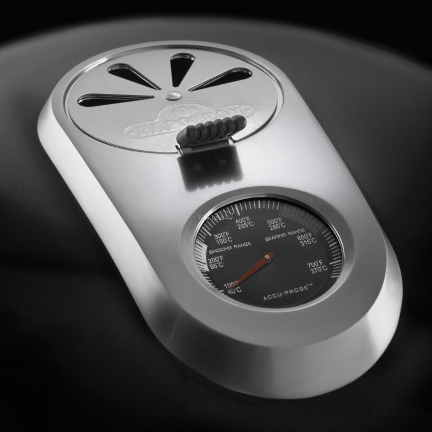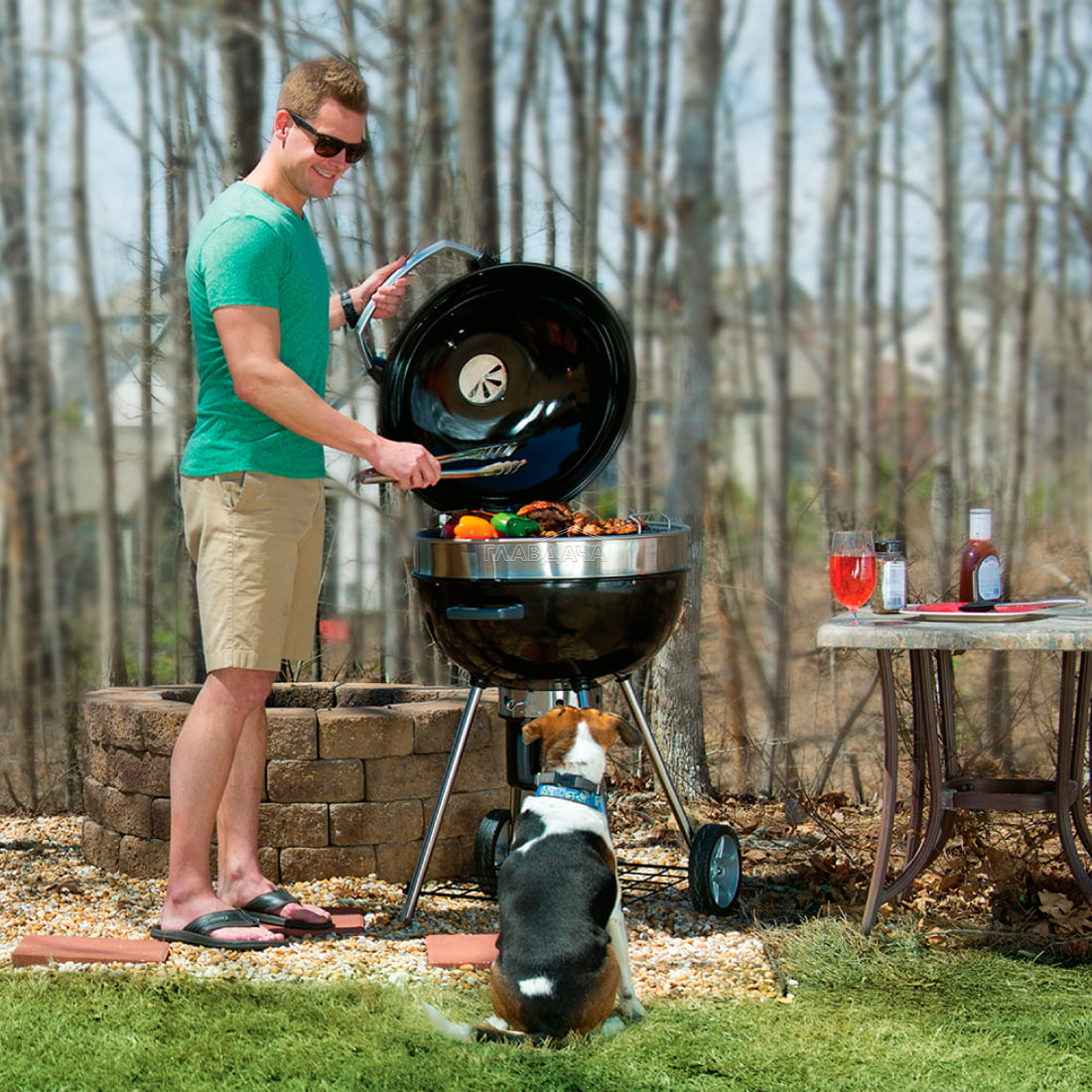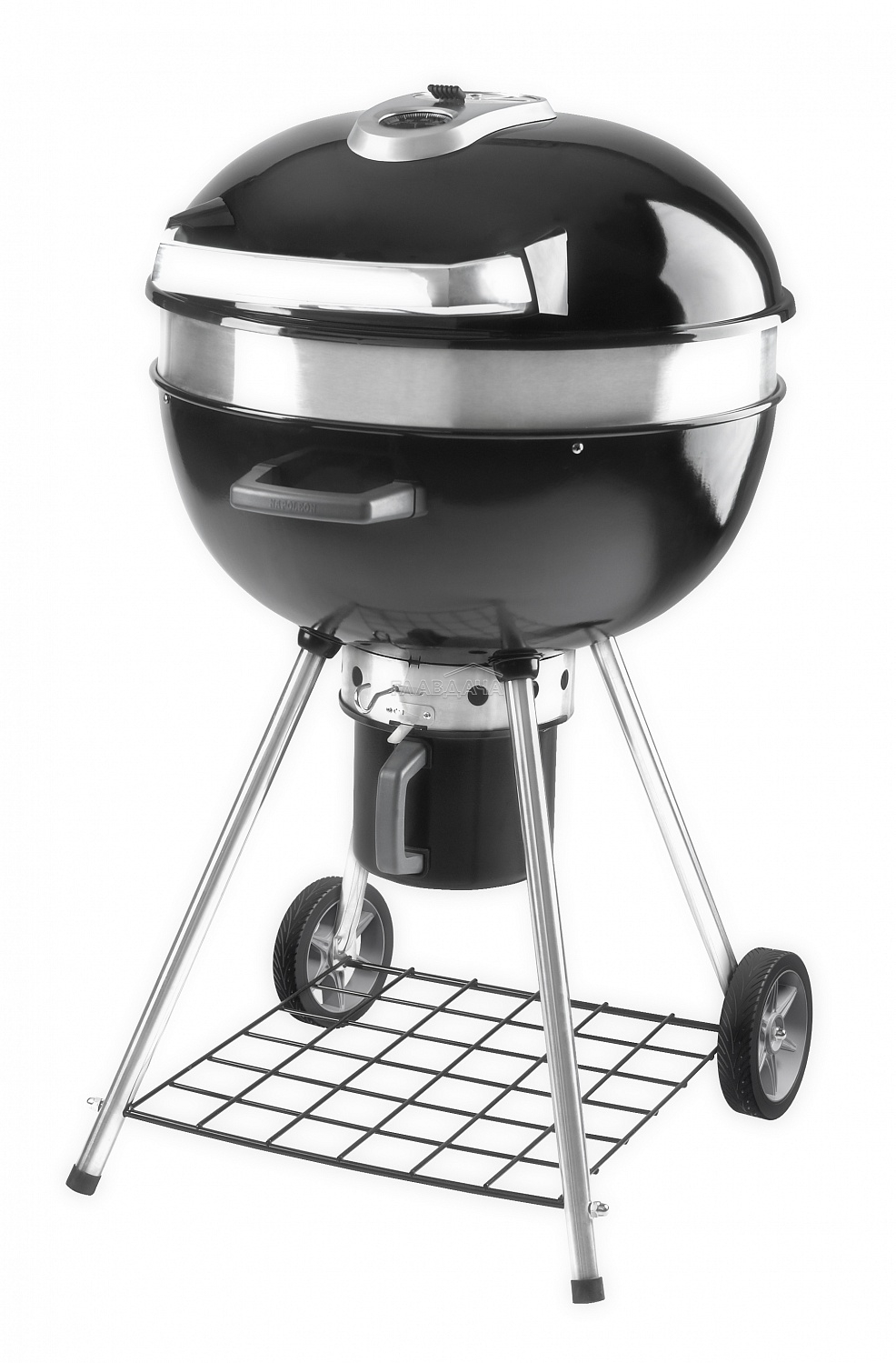 Внутри гриля расположена чугунная решётка, которую можно устанавливать на трёх различных уровнях, что позволяет создать нужный температурный режим и готовить прямым или косвенным методом. В крышку гриля установлен термометр для точного контроля температуры при готовке. Подкоптите мясо, рыбу или птицу с помощью ароматной щепы. Просто добавьте предварительно замоченную древесную щепу в раскалённый уголь. Для безопасной эксплуатации крышка гриля оснащена фиксатором, а её ручка не нагревается, это обеспечивает удобство при готовке и обезопасит Вас от ожогов. Гриль покрыт жаростойкой фарфоровой эмалью чёрного цвета, что продлит срок его службы.