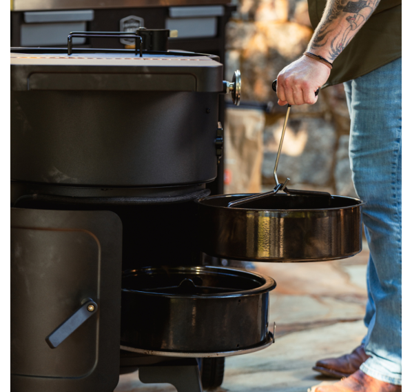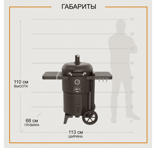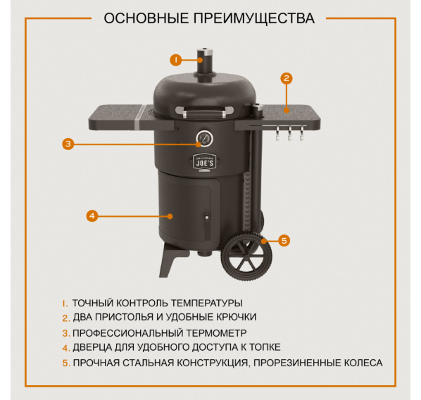 - Возможность загрузить до 3,6 кг угля или дров, обеспечивая до 14 часов стабильного копчения;