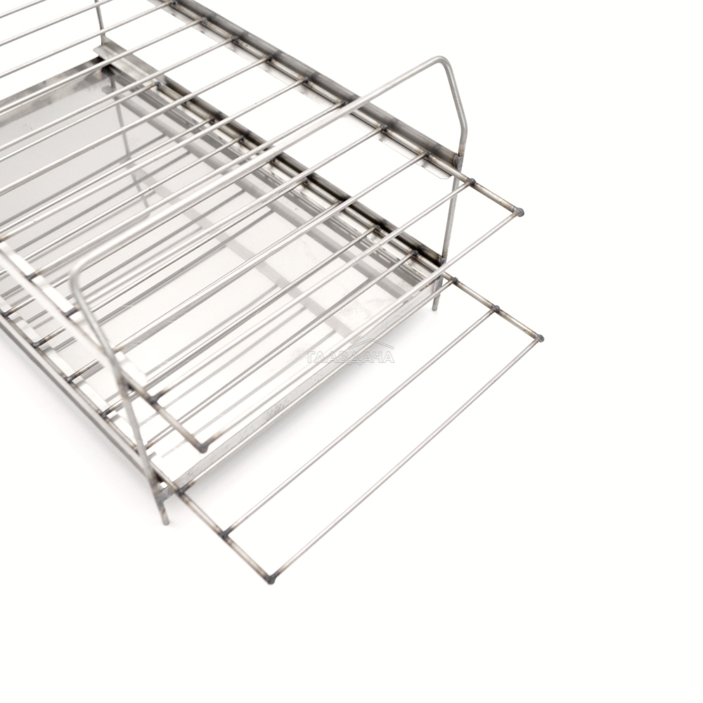 Две съёмные решётки для копчения и поддон для сбора жира с ручками для удобства закладки и извлечения продуктов. Решётки и поддон выполнены из нержавеющей стали.