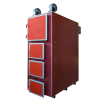 Предназначен для отопления загородных домов, складских и промышленных зданий, офисных и жилых помещений, площадью от 600-2500 кв.м., оборудованных системами водяного отопления с принудительной циркуляцией. Преимущества: Высокий КПД (по результатам проведенных испытаний данный котел позволяет экономить до 30% твердого топлива); Возможность функционирования в автоматическом режиме: данный котел оборудован вентилятором наддува и микропроцессорным регулятором, которые позволяют контролировать мощность котла; Уникальность конструкции: она позволяет использовать любой вид твердого топлива (уголь, древесину). Также в котле используется регулируемая система распределения подачи воздуха в зоны активного горения и дожига, что позволяет максимально эффективно управлять процессом сгорания топлива в камере при различной мощности котла; Топка котла представляет собой засыпную камеру, имеющую развитую поверхность теплообмена со всех стенок, потолка, части дна, оборудованную водотрубным теплообменником, что позволяет сделать процесс горения максимально эффективным. Длительное время горения топлива: при выходе на рабочую мощность котла, длительность его бесперебойной работы составляет от 3 до 16 часов. Соотношение приемлемой цены с высокими показателями качества: по сравнению с импортными аналогами данный котел значительно ниже по цене, а благодаря использованию современных производственных технологий и автоматизации процессов, качество выпускаемых котлов постоянно улучшается. Постоянное складское наличие, высокая скорость отгрузки покупателям и короткий срок изготовления. Описание: Промышленный отопительный твердотопливный котел оборудован жаротрубным теплообменником, закрытый снаружи водяной рубашкой. Теплообменник представляет собой многоступенчатую конструкцию дымовых каналов. Горячие газы после зоны дожига проходят через стальной жаротрубный теплообменник, где, отдав тепло, охлаждаются. Охлажденные газы выходят из котла через дымоход, соединенный с дымовым патрубком. Расположение дверей теплообменника, засыпной, камеры сгорания и зольника позволяет получить быстрый доступ к топке для очистки и розжига. Широкая засыпная дверца облегчает загрузку топлива. Воздух, необходимый для правильного процесса сжигания, подается вентилятором благодаря системе наддувных втулок, расположенных непосредственно в области загруженного топлива. Микропроцессорный регулятор постоянно измеряет температуру воды в котле и соответственно устанавливает силу наддува вентилятора, регулируя количество воздуха, необходимого для процесса сжигания.