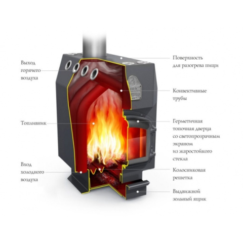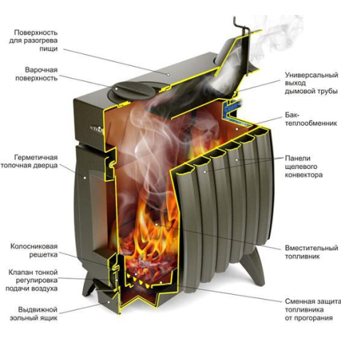 - Тип топлива. Дрова — универсальное решение, уголь и брикеты — для длительного горения.
