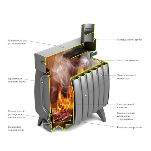 Рекомендуется удалять золу после 5–7 топок и проводить полную чистку дымохода дважды в год. - Можно ли подключить отопительные радиаторы?