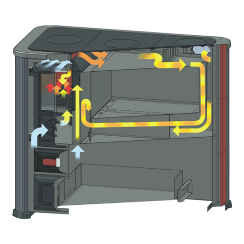 - Энергоэффективность достигается за счёт герметичной топки, точной регулировки подачи воздуха, корректной схемы дымохода.