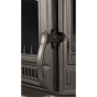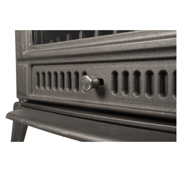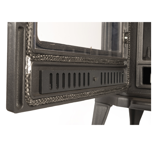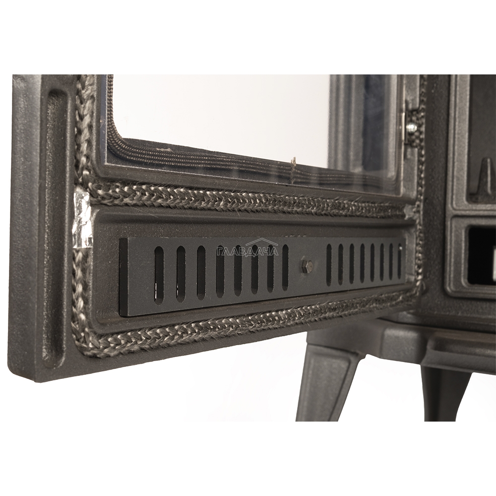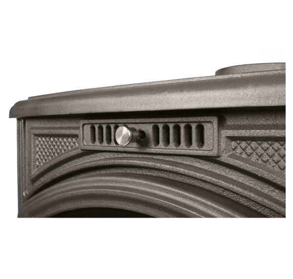 - Топочная дверца в виде арки с плоским жаростойким стеклом занимает большую часть передней панели печи, закрывая зольник. В верхней части дверцы расположен регулятор подачи воздуха на обдув стекла, в нижней - подачи воздуха на горение (через колосник). Благодаря высокой герметичности топки, управлять горением легко - печь быстро отзывается на изменение интенсивности поступления кислорода.