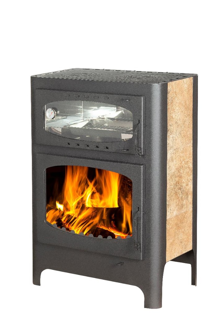 Печь-камин “Бавария Эко” с духовкой и плитой с легкостью заменит небольшую дачную кухню. Большая плита на две конфорки и полноценный духовой шкаф позволят приготовить как первые, так и вторые блюда, включая мясо, овощи и рыбу гриль. Высота печи составляет один метр, таким образом, пользоваться ей достаточно удобно. Благодаря сдержанному дизайну печь-камин отлично впишется в любое помещение. Прибор рассчитан на пристенную установку, дымоход подключается сверху.