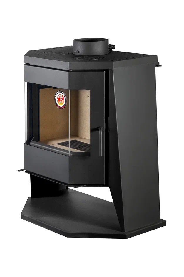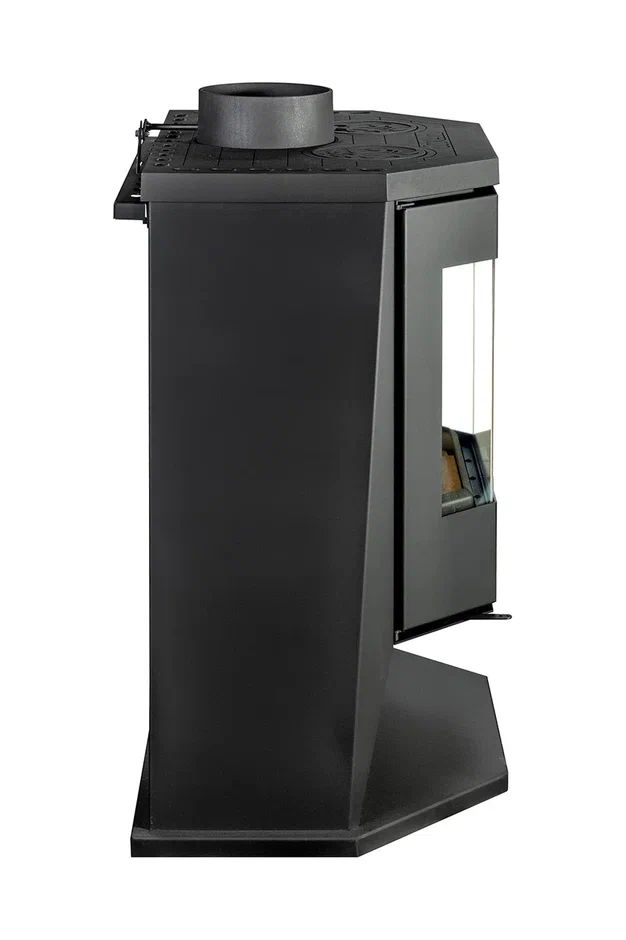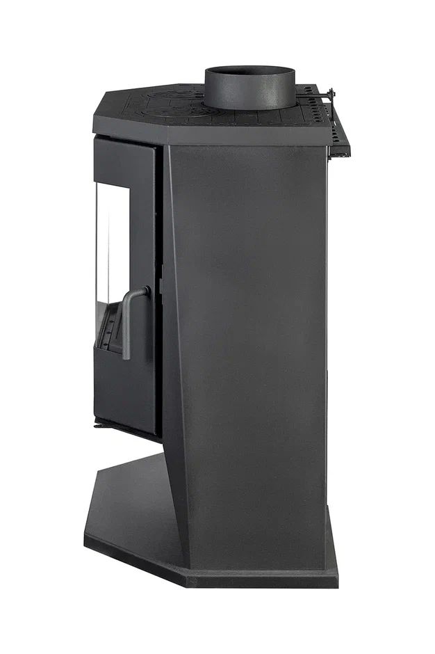 Угольно-черная печь-камин “Бавария Панорама” с плитой и огромным призматическим стеклом отлично справится не только с обогревом помещения площадью до 100 кв. м., но и с приготовлением пищи. Печь топится дровами и топливными брикетами, ее удобно использовать на даче или в загородном доме. Прибор прост в установке, не требует монтажа специального фундамента, а возможность выбора верхнего или бокового вывода дымохода снимает все ограничения по выбору места инсталляции.