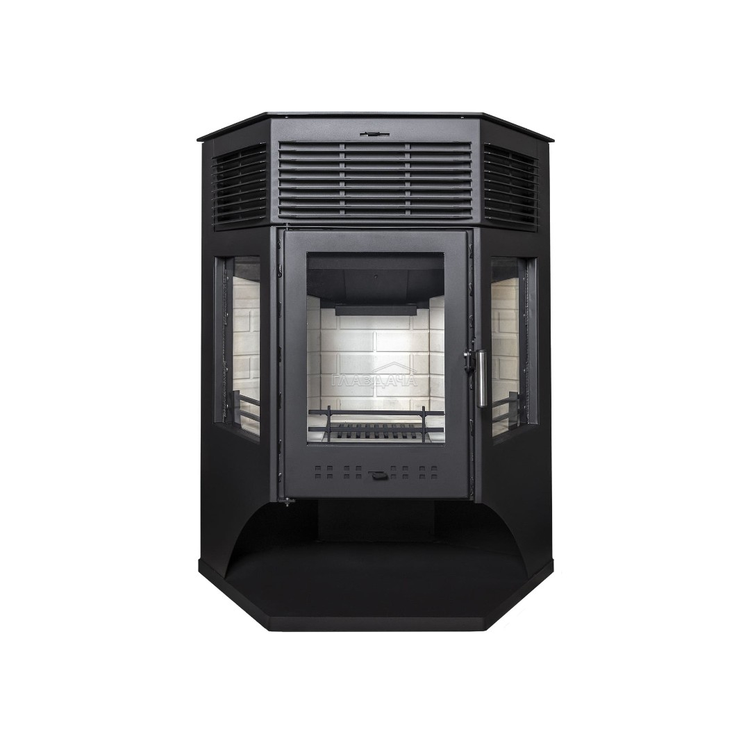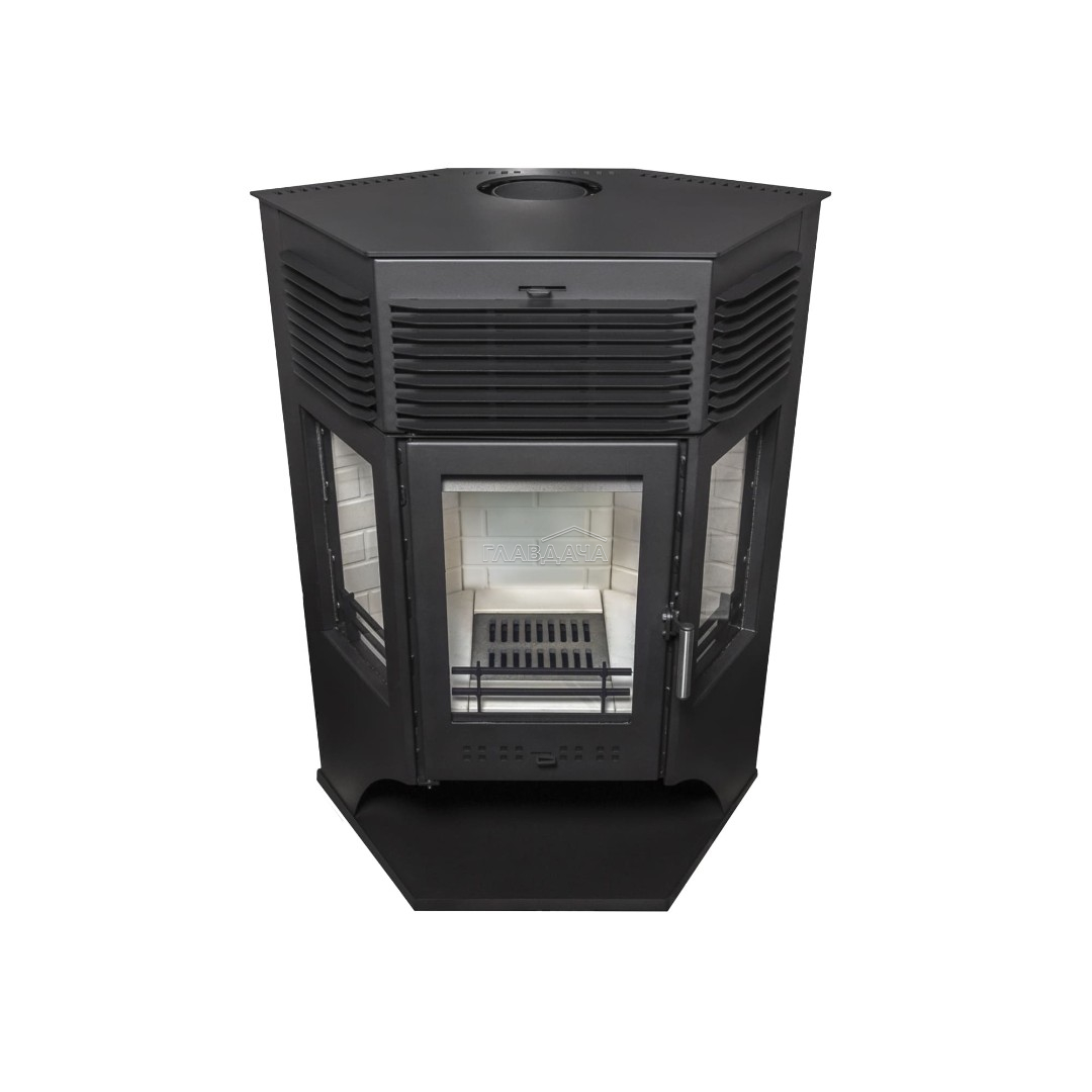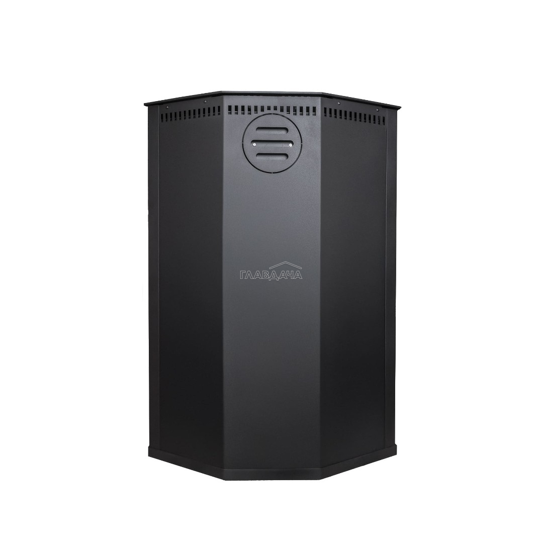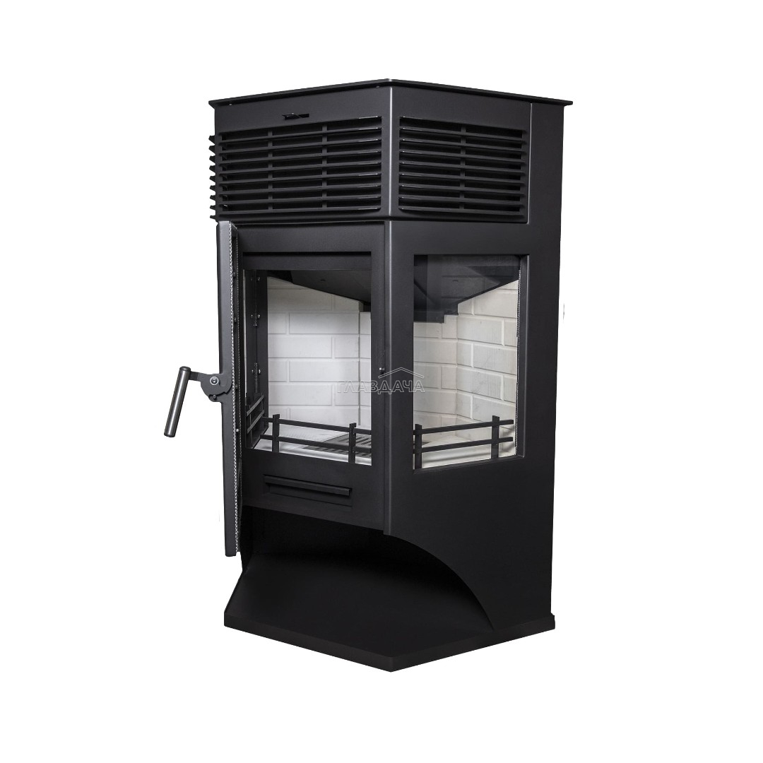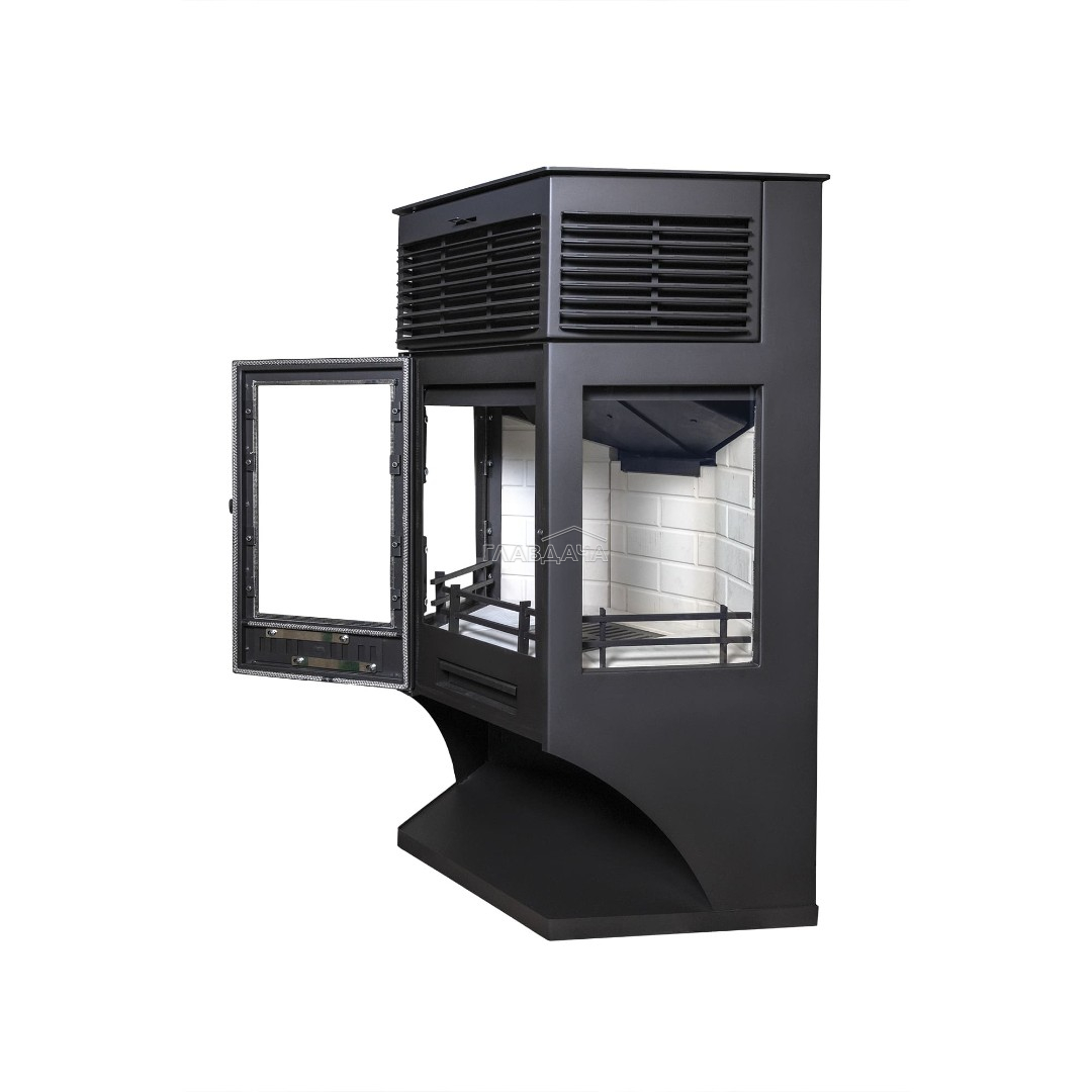 Печь-камин Москва 12 может размещаться у стены либо в углу комнаты. Универсальное подключение дымохода (сверху либо сзади). Печь оснащена призматической дверцей с крупными стеклами.