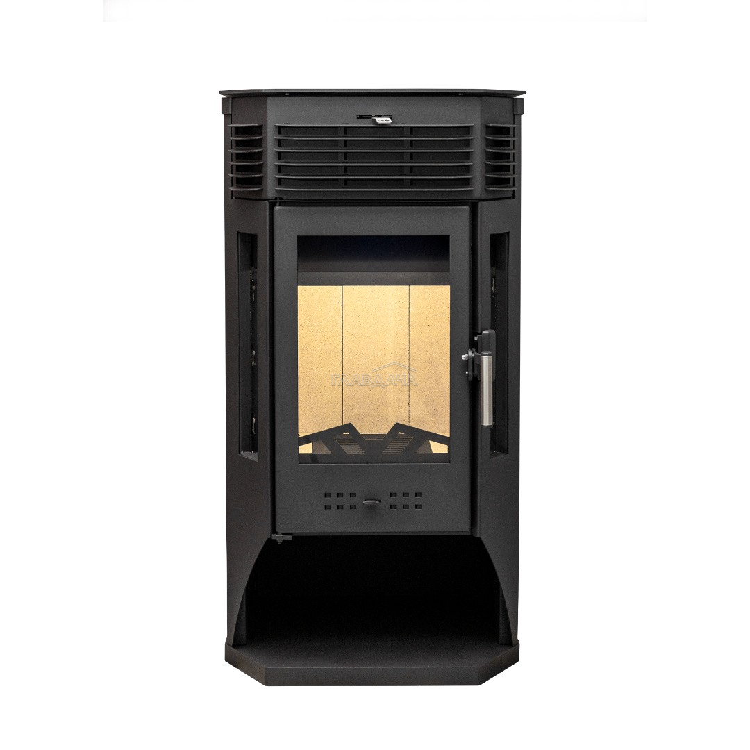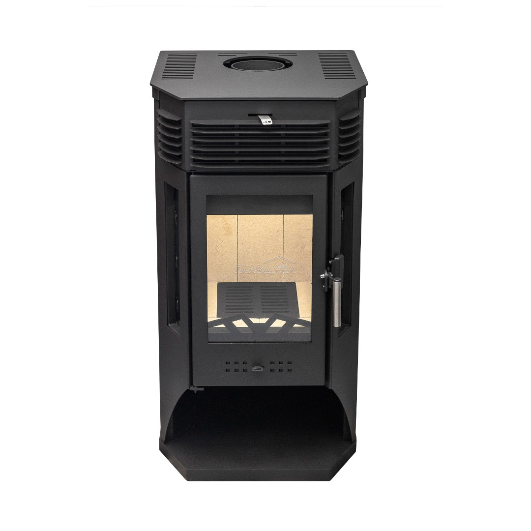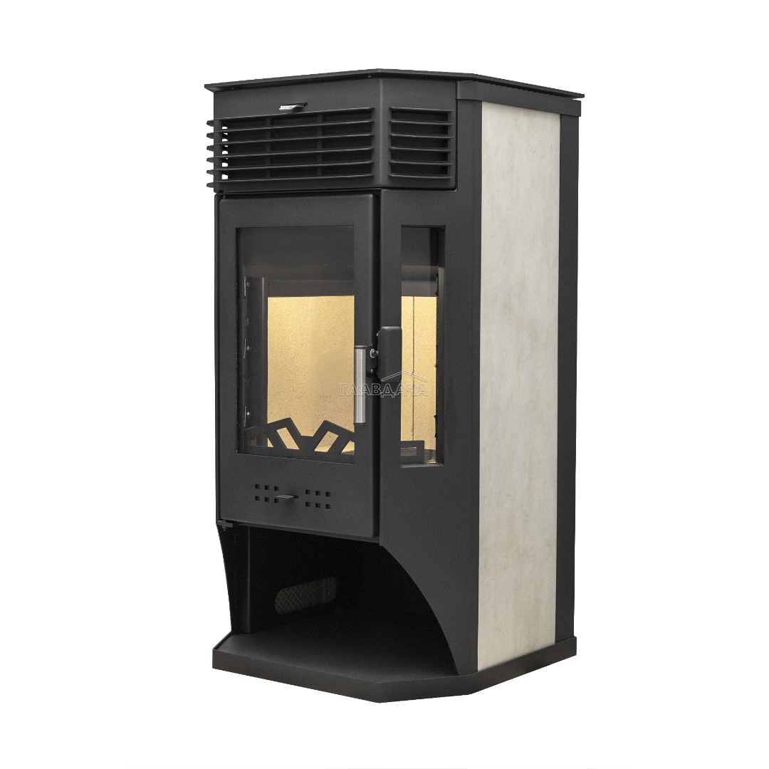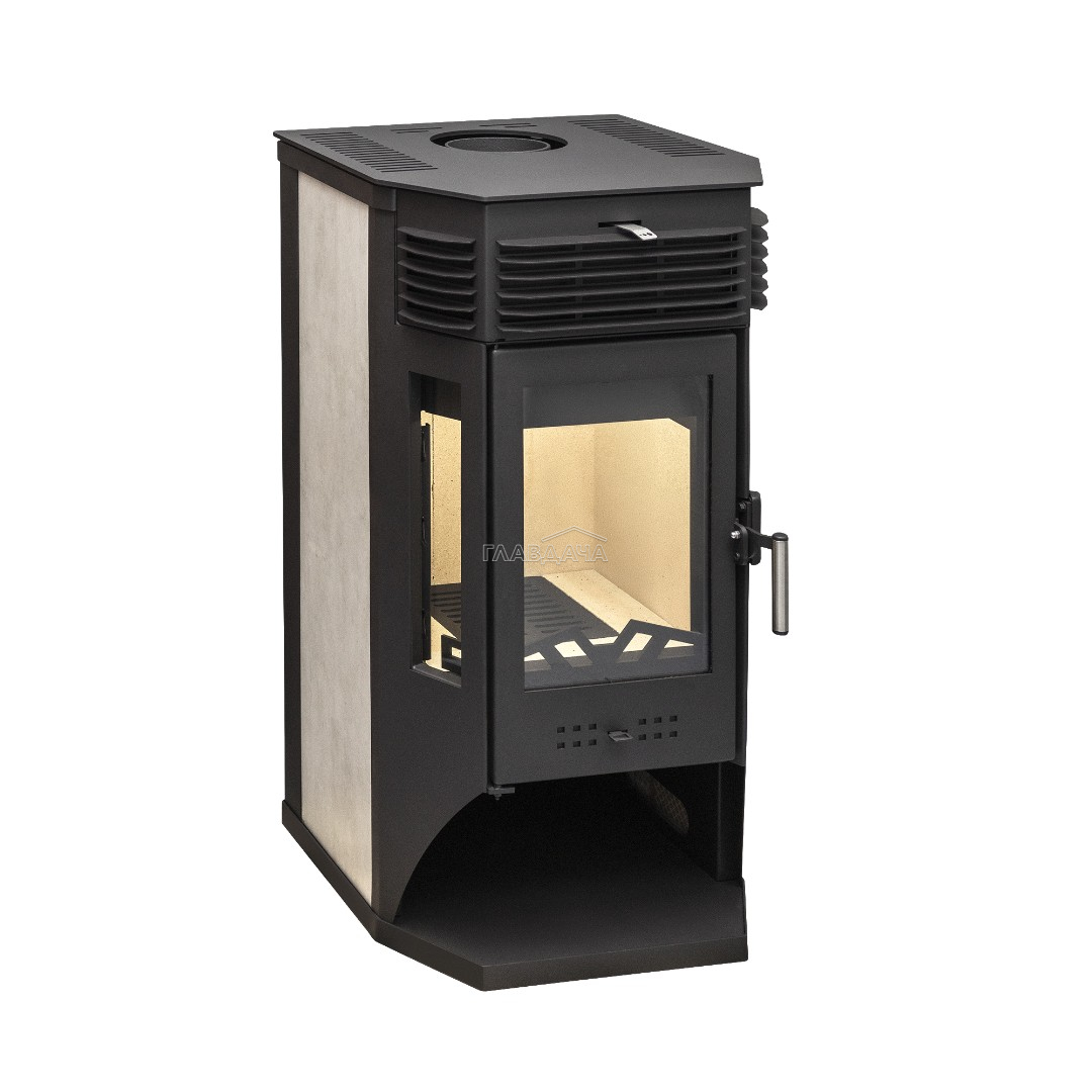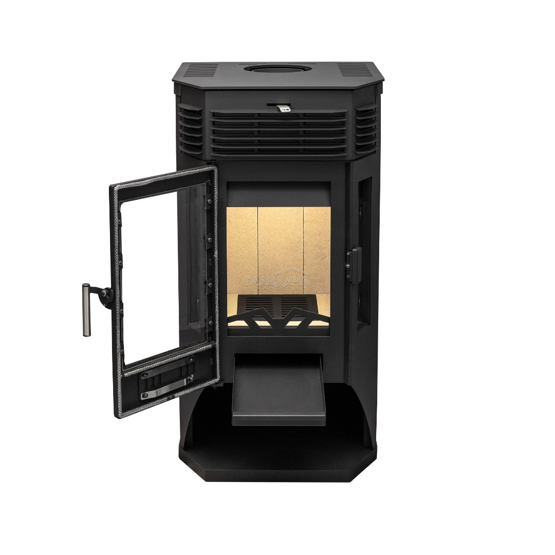 Печь-камин Москва 9 может размещаться у стены либо в углу комнаты. Универсальное подключение дымохода (сверху, либо сзади). Печь оснащена призматической дверцей с крупными стеклами.