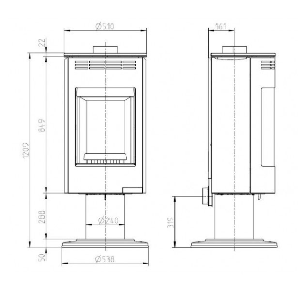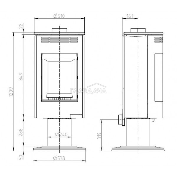 - Дверца, занимающая всю переднюю панель, герметично закрывается, что исключает возможность случайного попадания дыма в помещение. Ручка утапливается в дверцу, так что выступающие элементы на корпусе печи отсутствуют.