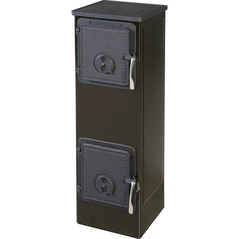 Черная отопительно-варочная дровяная печь.