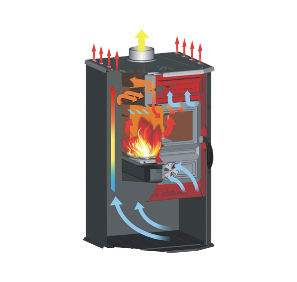 Magic Stove изготовлена из стали, помещение обогревается за счет конвекции. Для этого в корпусе печи сделано большое количество вентиляционных отверстий, благодаря чему воздух начинает нагреваться сразу же после розжига. В качестве топлива можно использовать дрова или топливные пеллеты.