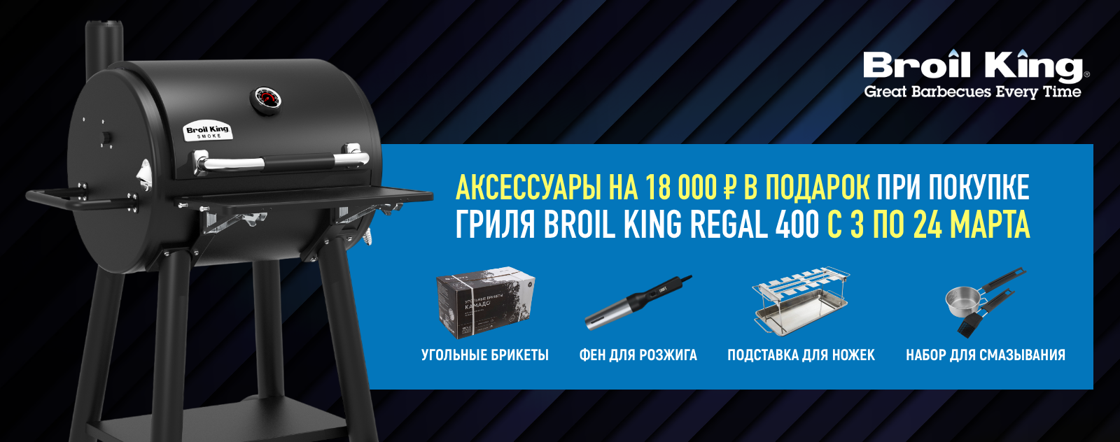Купил гриль — получил подарки! Специально для любителей готовить вкуснейшие блюда на открытом огне мы подготовили уникальное предложение! Покупая угольный гриль Broil King Regal 400, вы получаете 4 аксессуара на сумму 18 000 ₽ в подарок! Акция действует с 3 по 24 марта 2026 года.