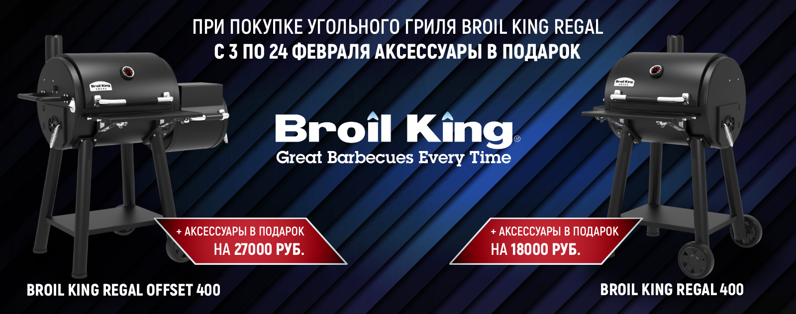 Купил гриль — получил подарки! Специально для любителей готовить вкуснейшие блюда на открытом огне мы подготовили уникальное предложение! Покупая угольный гриль Broil King Regal 400 или Regal Offset 400, вы получаете аксессуары в подарок! Акция действует с 3 февраля по 24 февраля 2026 года.