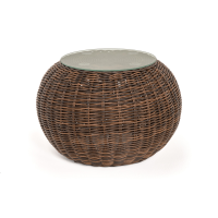 Модель состоит из каркаса, обвитого вручную ротангом коричневого цвета. Данный образец обладает ударопрочной стеклянной 5 мм столешницей, конструкцией предусмотрена полочка для принадлежностей.