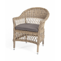 Стул оплетен вручную круглым искусственным ротангом коричневого оттенка. В комплекте представлена мягкая подушка-сиденье серого цвета. Подушка имеет съёмный чехол из полиэстера (100%), плотностью 300гр/м2, с влагоотталкивающей пропиткой.