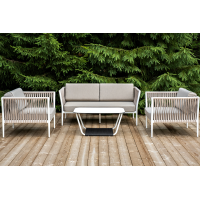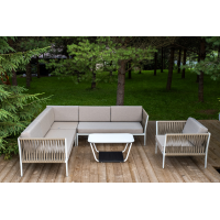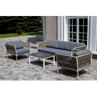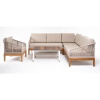 Каркас уличной мебели выполнен из дуба. Его дополняет бежевая оплетка, изготовленная на основе эластичных синтетических лент из полиэфирных волокон высокой прочности.