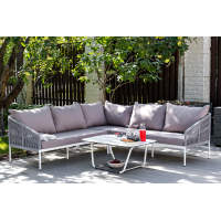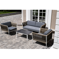 4 кресла из коллекции «Бордо», выполненных из алюминиевого каркаса и ручной оплетки роупом. Это эластичные синтетические ленты из высокопрочных полиэфирных волокон, представлены в сером цвете.