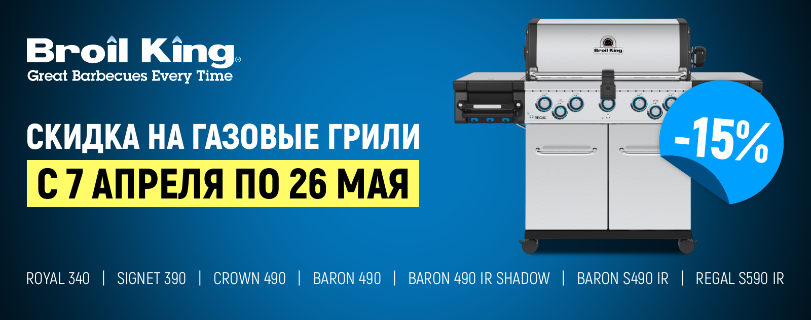 Открываем сезон BBQ: жарим по-крупному! Весна в разгаре, а значит, пора собирать друзей на заднем дворе! В честь старта BBQ-сезона мы запускаем огненную акцию! Покупая газовый гриль Broil King, вы получаете дополнительную скидку -15%! Акция действует с 7 апреля по 26 мая 2026 года.
