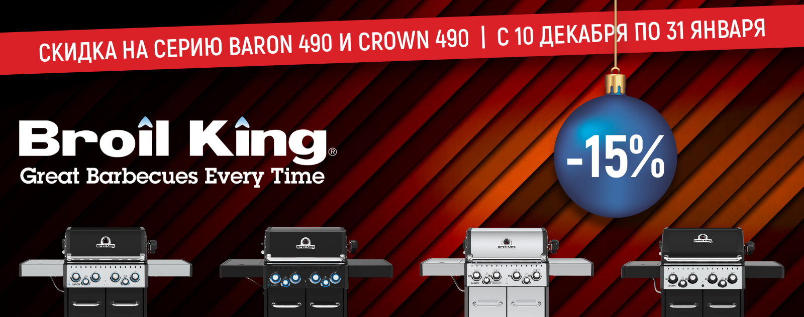 Приближается Новый год, и мы решили сделать этот праздник особенным вместе с вами! Подготовьте себя и близких к вкусному отдыху на свежем воздухе в любое время года благодаря нашим газовым грилям премиум-класса. Покупая любой гриль Broil King серии Baron 490 и Crown 490, вы получаете дополнительную скидку -15%! Акция действует с 10 декабря 2025 года по 31 января 2026 года.