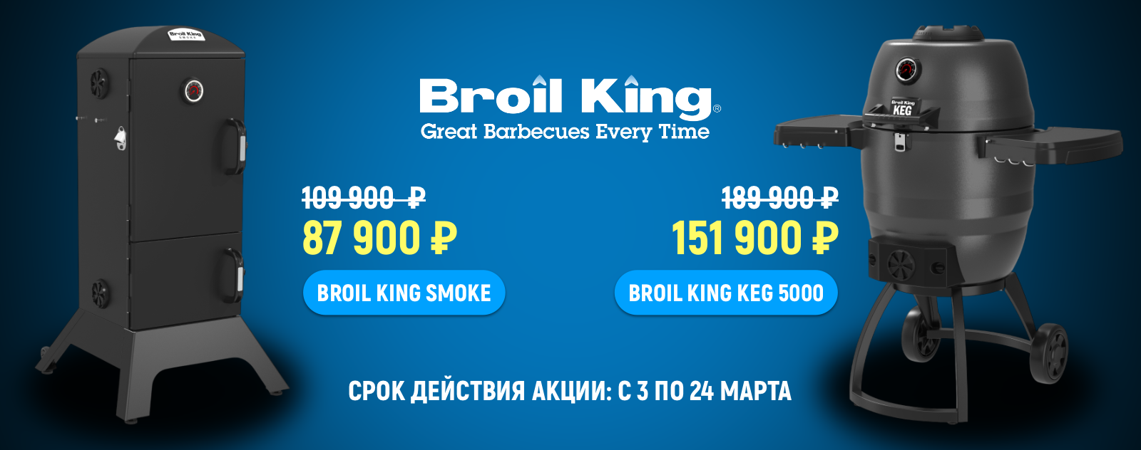 Успейте воспользоваться выгодным предложением и приготовьте вкуснейшие блюда на свежем воздухе! Покупая вертикальную угольную коптильню Broil King Smoke или угольный гриль KEG 5000, вы получаете дополнительную скидку -20%! Акция действует с 3 по 24 марта 2026 года.