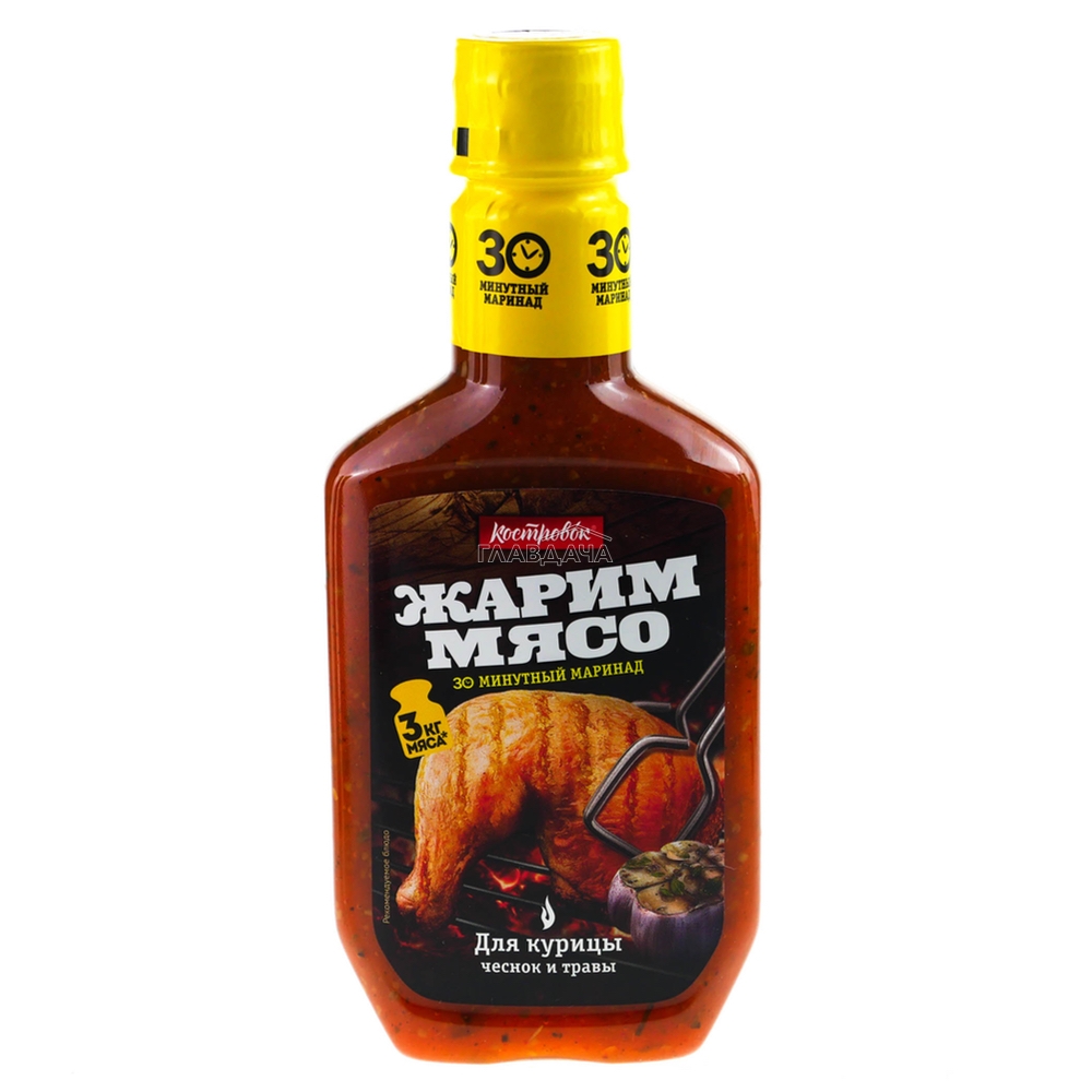 Маринад для приготовления курицы на гриле, мангале или в духовке. Продукт позволяет замариновать курицу всего за 30 минут, придаёт блюдам яркий вкус и сохраняет сочность мяса. Маринад содержит достаточное количество соли для приготовления. Одна бутылка рассчитана на 3 кг курицы.