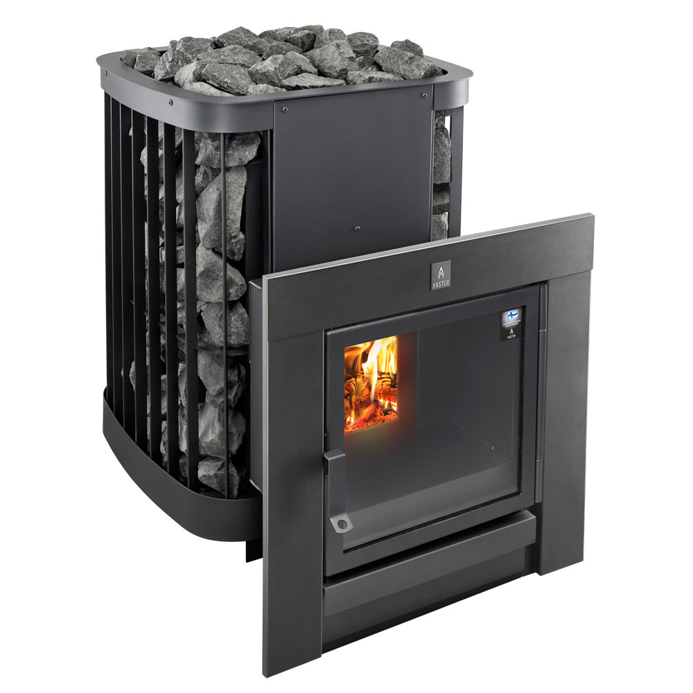 Печь для бани и сауны с выносной топкой. Рамка - нержавеющая сталь, окрашенная в чёрный цвет. Объем парилки: 8-24 м3