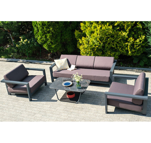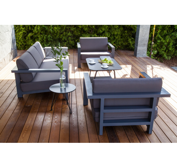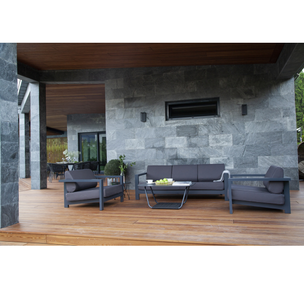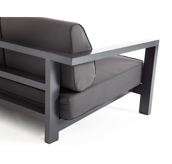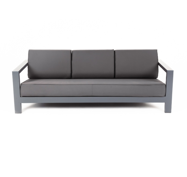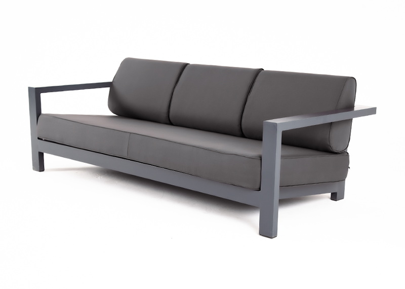 Стильный трехместный диван «Гранада» для обустройства зоны отдыха на балконе, в кафе или летней веранде. Каркас изготовлен из высокопрочного алюминия темно-серого (RAL7024) цвета.
