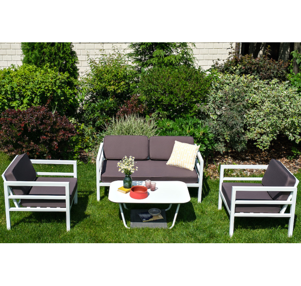 Каркас дивана и кресел выполнен из прочного алюминия и окрашен в белый цвет. Комплект дополняют подушки со съёмными чехлами и водоотталкивающей пропиткой. Материал чехлов - 100% полиэстер плотностью 300гр/м2.