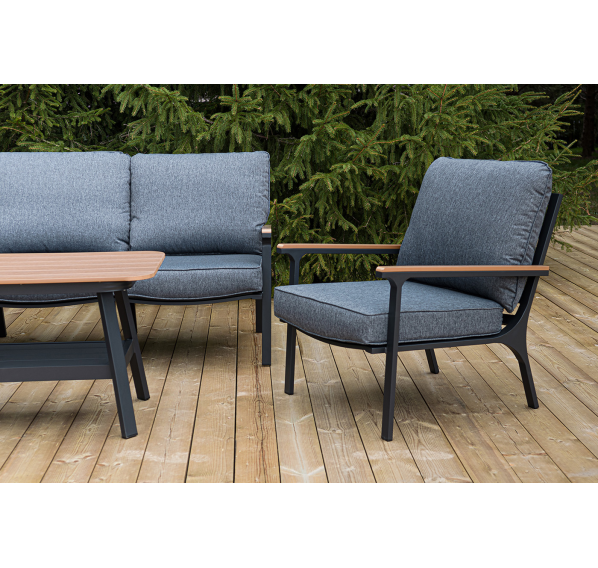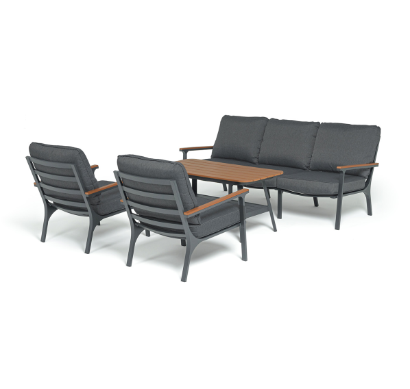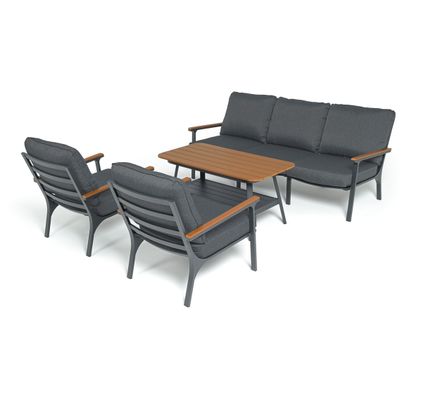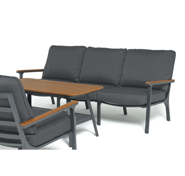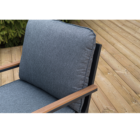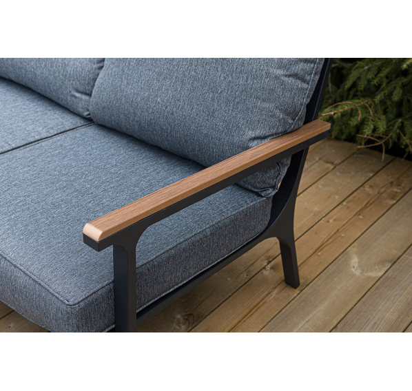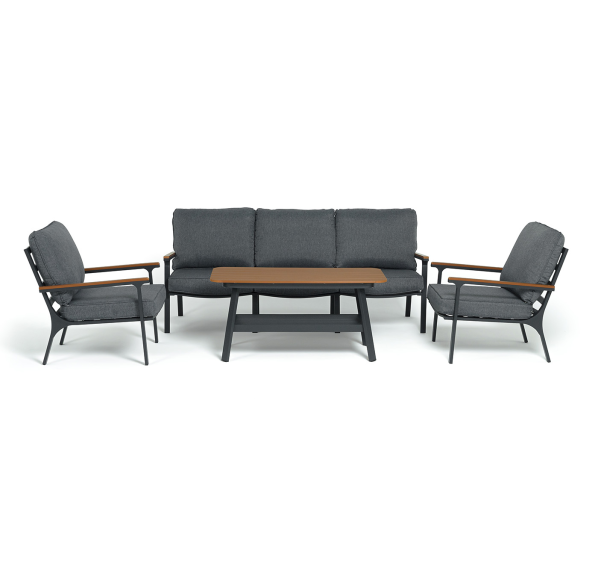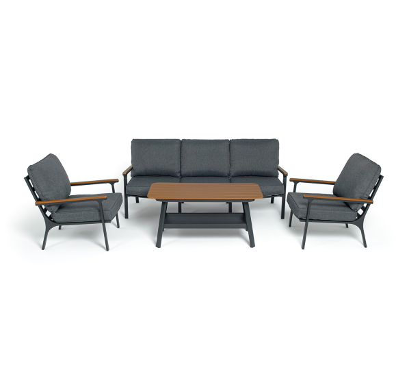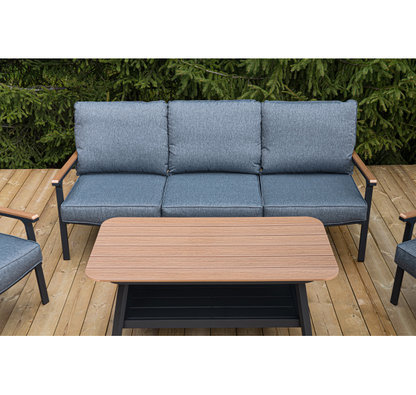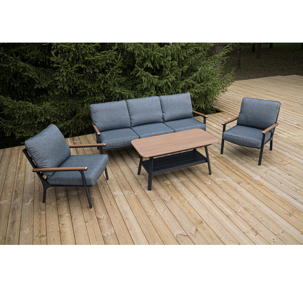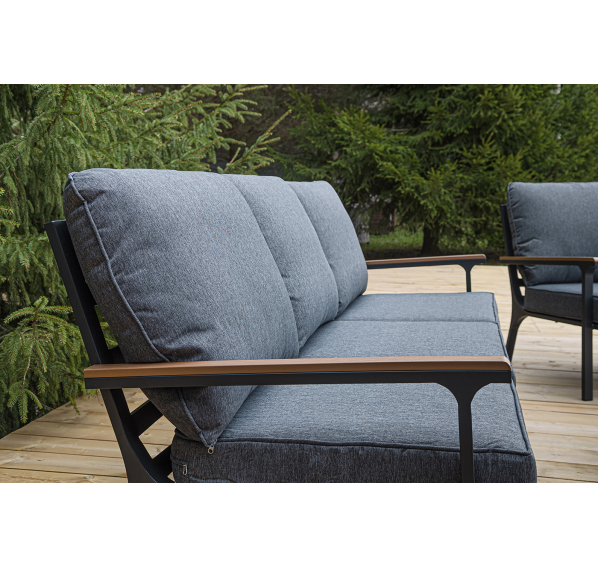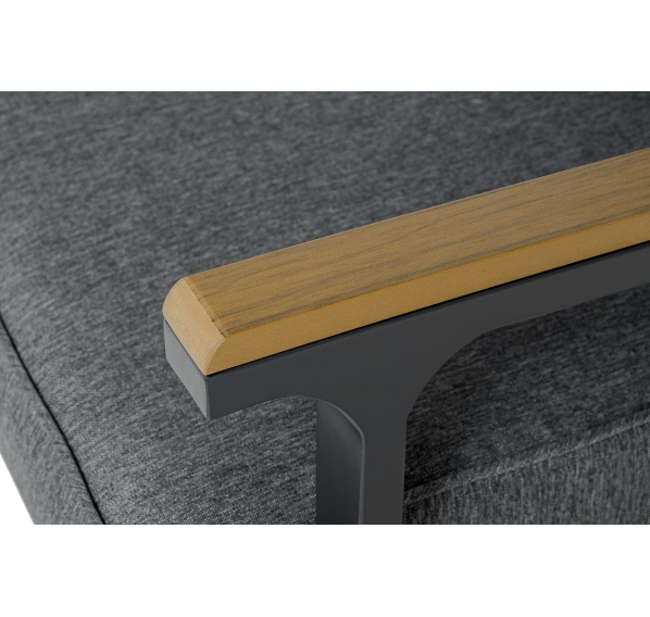 Каркас мебели выполнен из прочного алюминия темно-серого цвета. На подлокотниках дивана и двух кресел установлен облицовочный материал из древесно полимерного композита (ДПК) цвет «дерево». Крепление к каркасу осуществляется на болтах с пластиковыми заглушками темно-серого цвета, которые не ржавеют. Комплект дополняют подушки со съёмными чехлами. Материал чехлов - 100% полиэстер плотностью 190гр/м2.